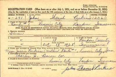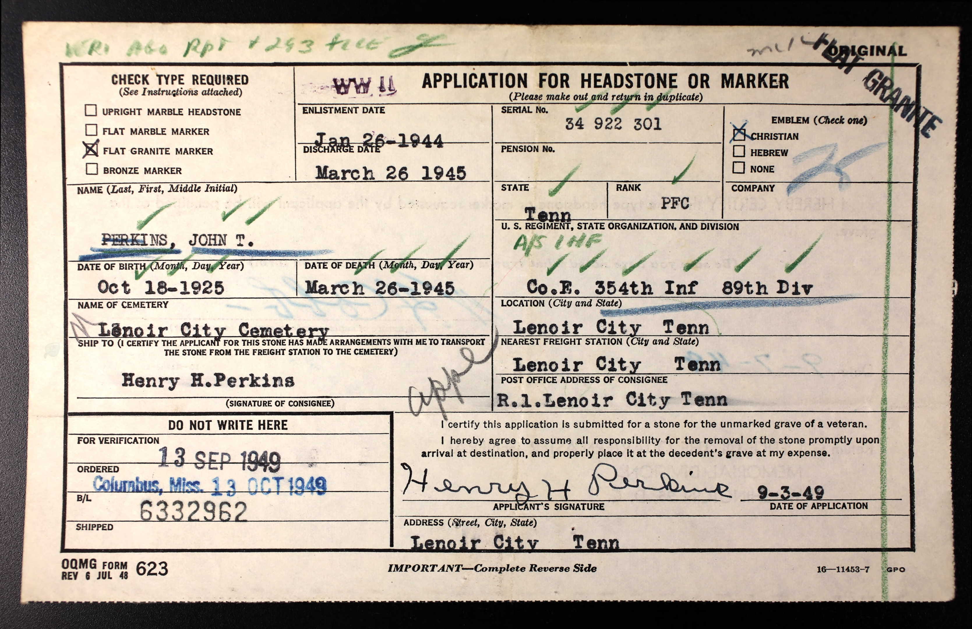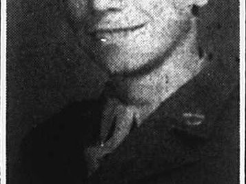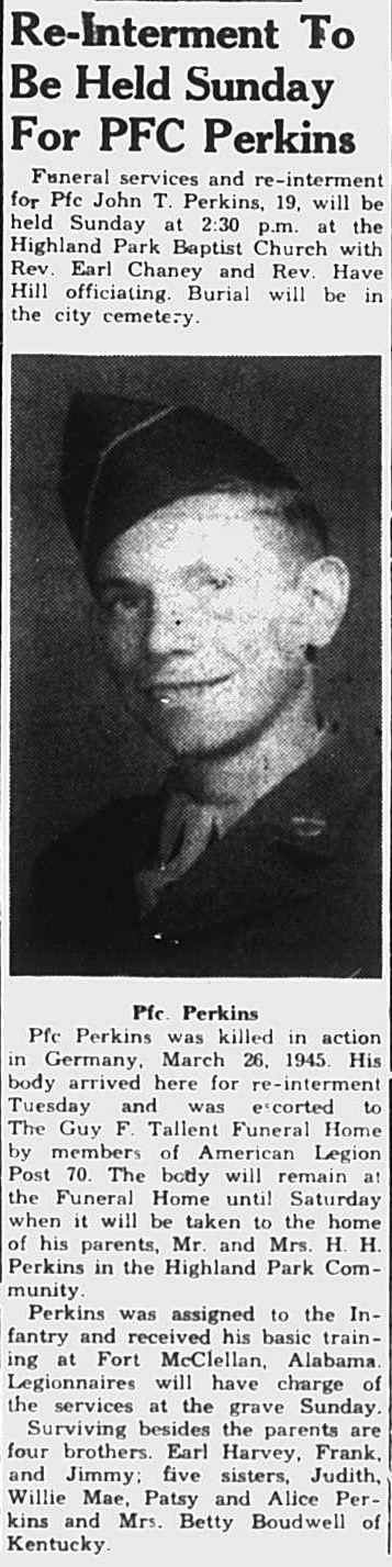 Pfc. Perkins was killed in action in Germany, March 26, 1945. His body arrived here for re-interment and was escorted to They Guy F. Tallent Funeral Home by members of American Leigon Post 70. Perkins was assigned to the Infantry and received his basic training at Fort McClellan, Alabama. Surviving besides his parents, Mr. and Mrs. H.H. Perkins are four brothers, Earl, Harvey, Frank and Jimmy; five sisters, Judith, Willie Mae, Patsy and Alice Perkins and Mrs. Betty Boudwell of Kentucky.