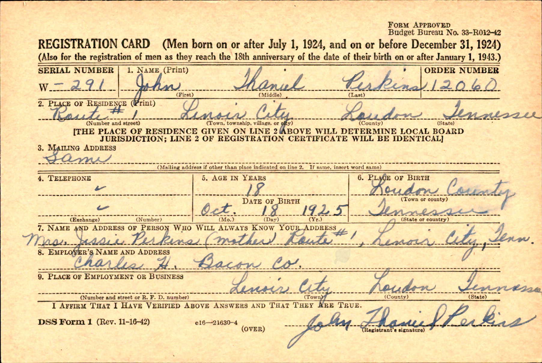 John Thaniel Perkins was born on 18 October 1925, the son of Henry Harvey Perkins and Jessie Mae Williams.