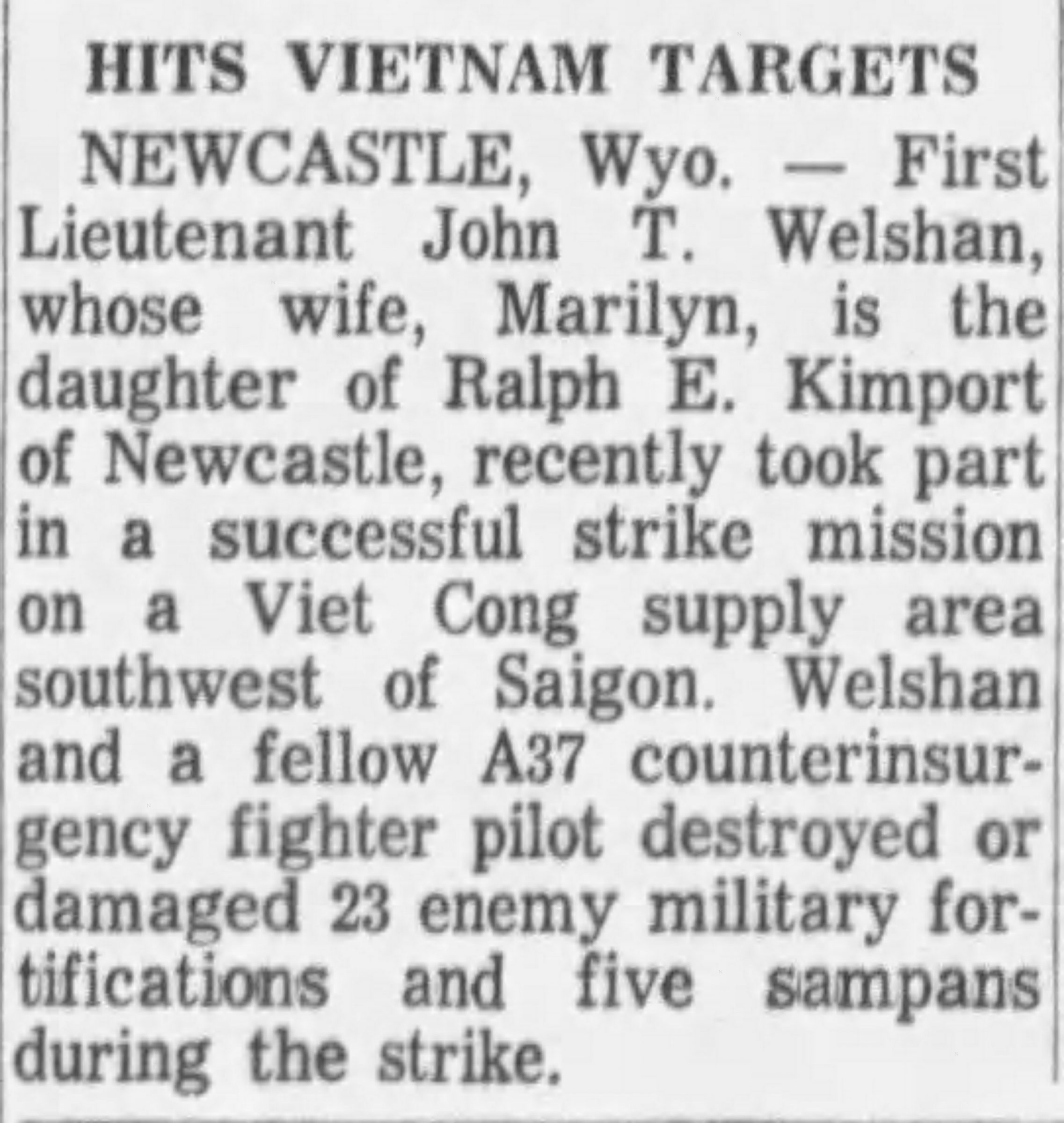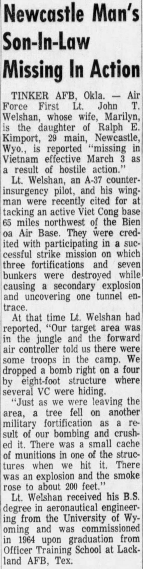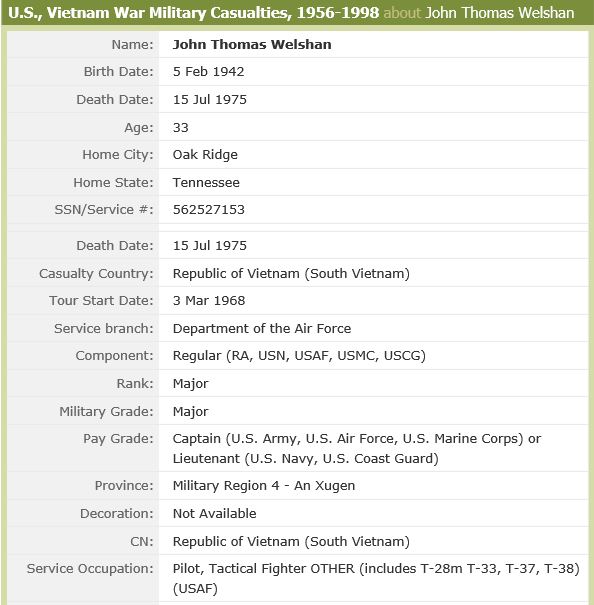 Major John Thomas Welshan started his tour on 3 March 1968. He died on 15 July 1975 when his aircraft crashed. His body was not recovered. He is memorialized at Arlington National Cemetery in Virginia.
