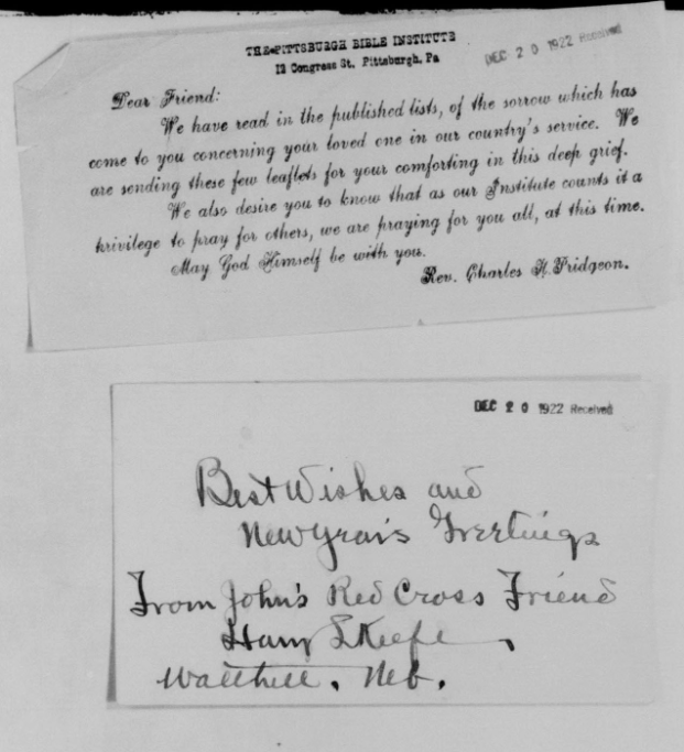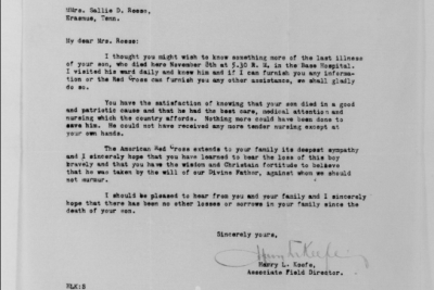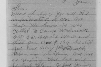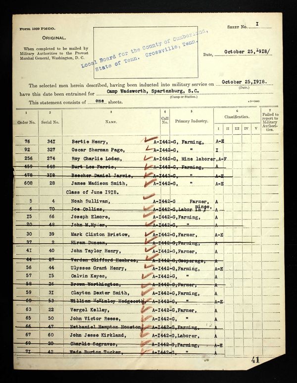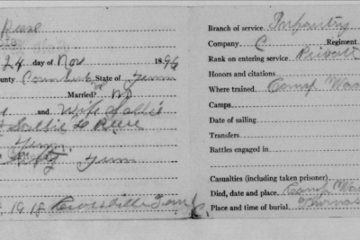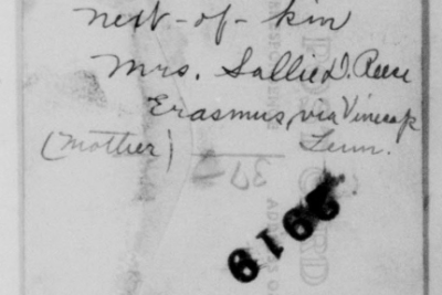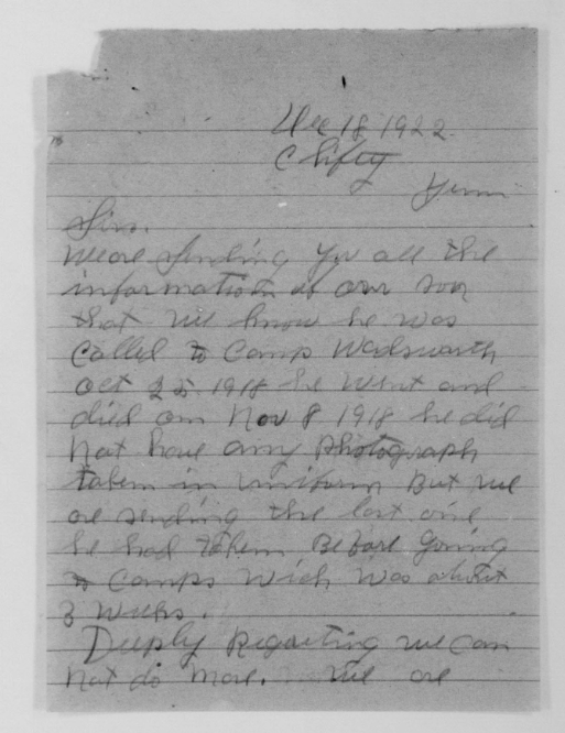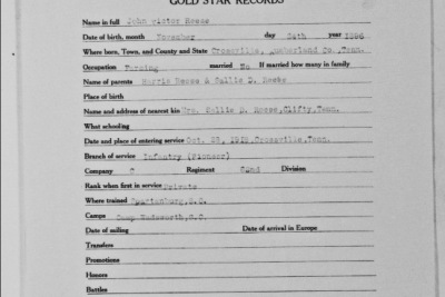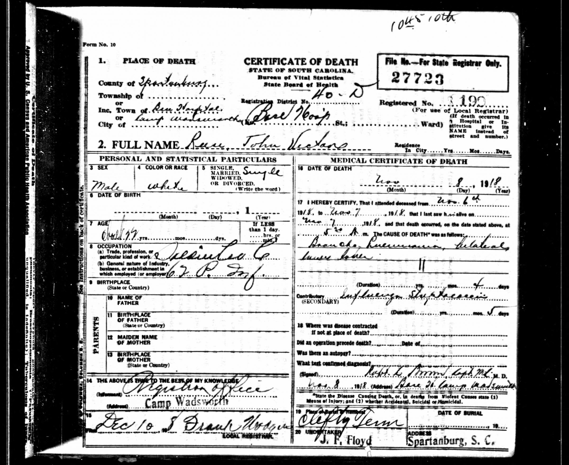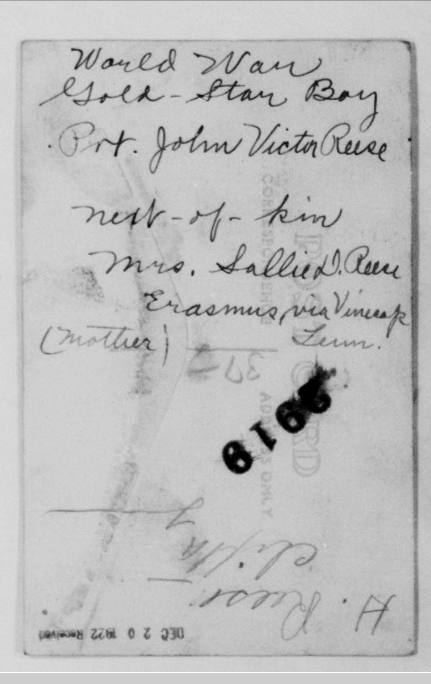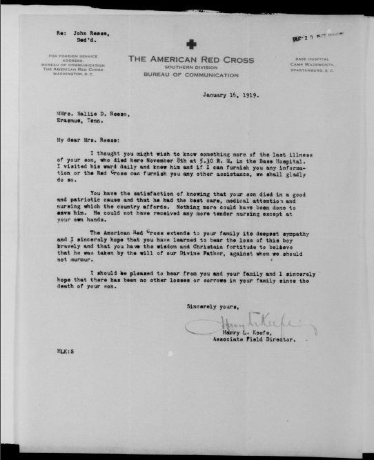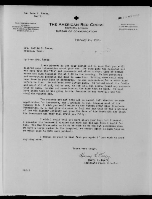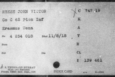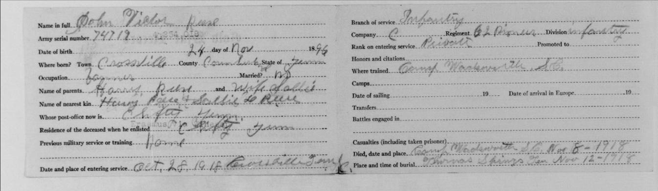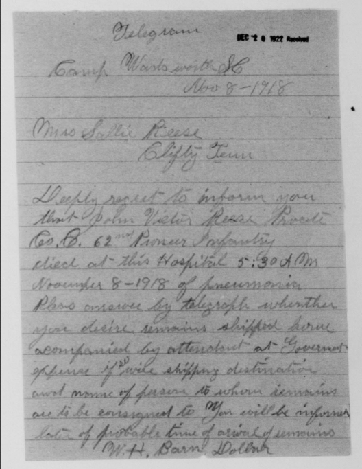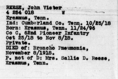 John Reese was inducted into military Service on 25 October 1918 at Camp Wadsworth, Spartanburg, South Carolina. He served with Company C, 62nd Pioneer Infantry. He died at the Base Hospital at Camp Wadsworth of Broncho Pneumonia.