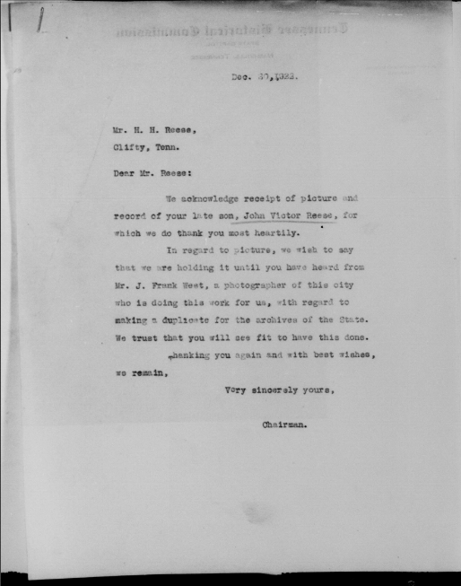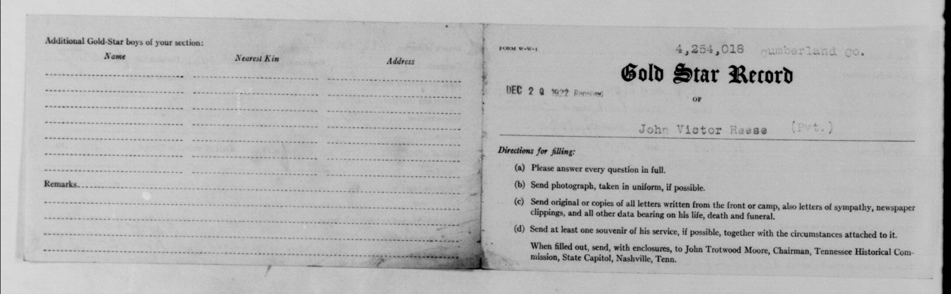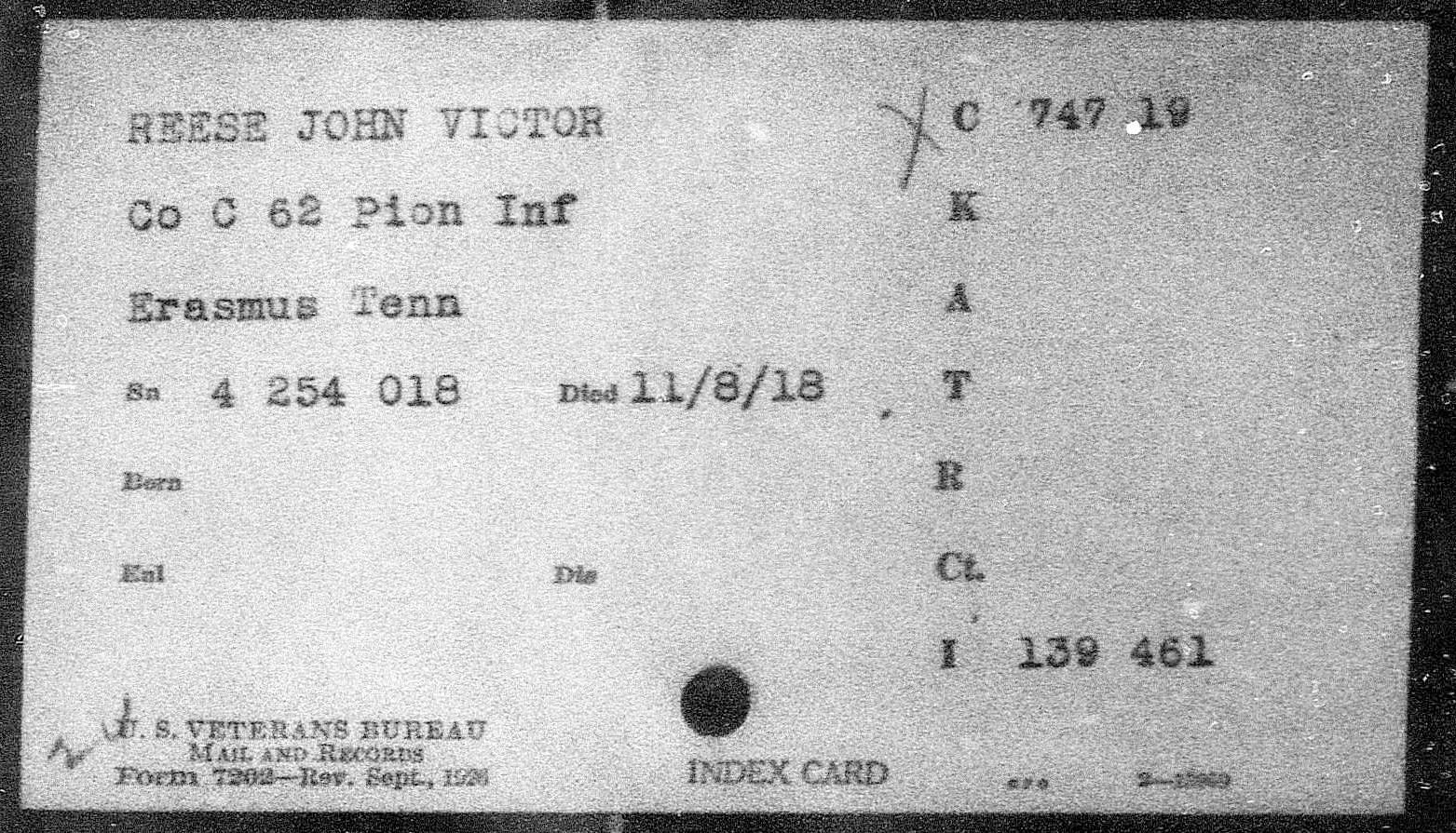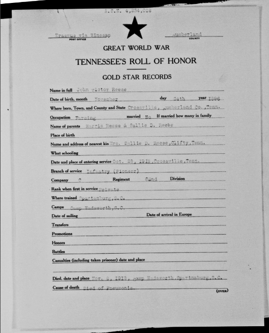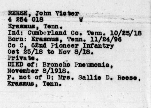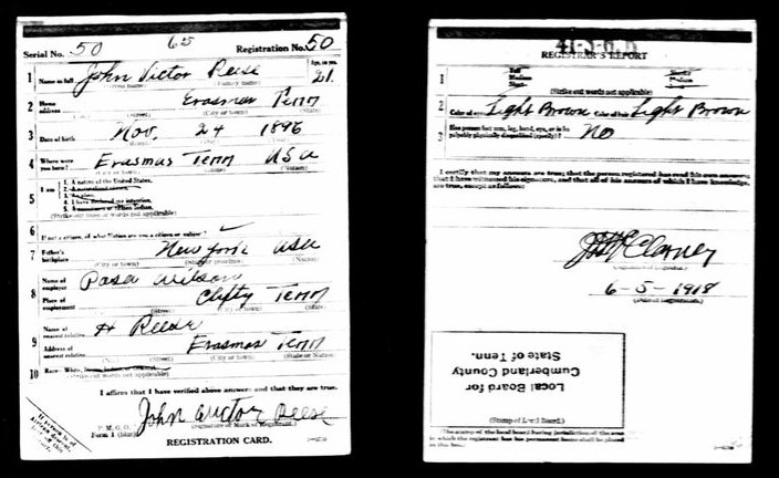 John Victor Reese was born 24 November 1896, Erasmus, Tennessee to Harris and Sallie D. Reese