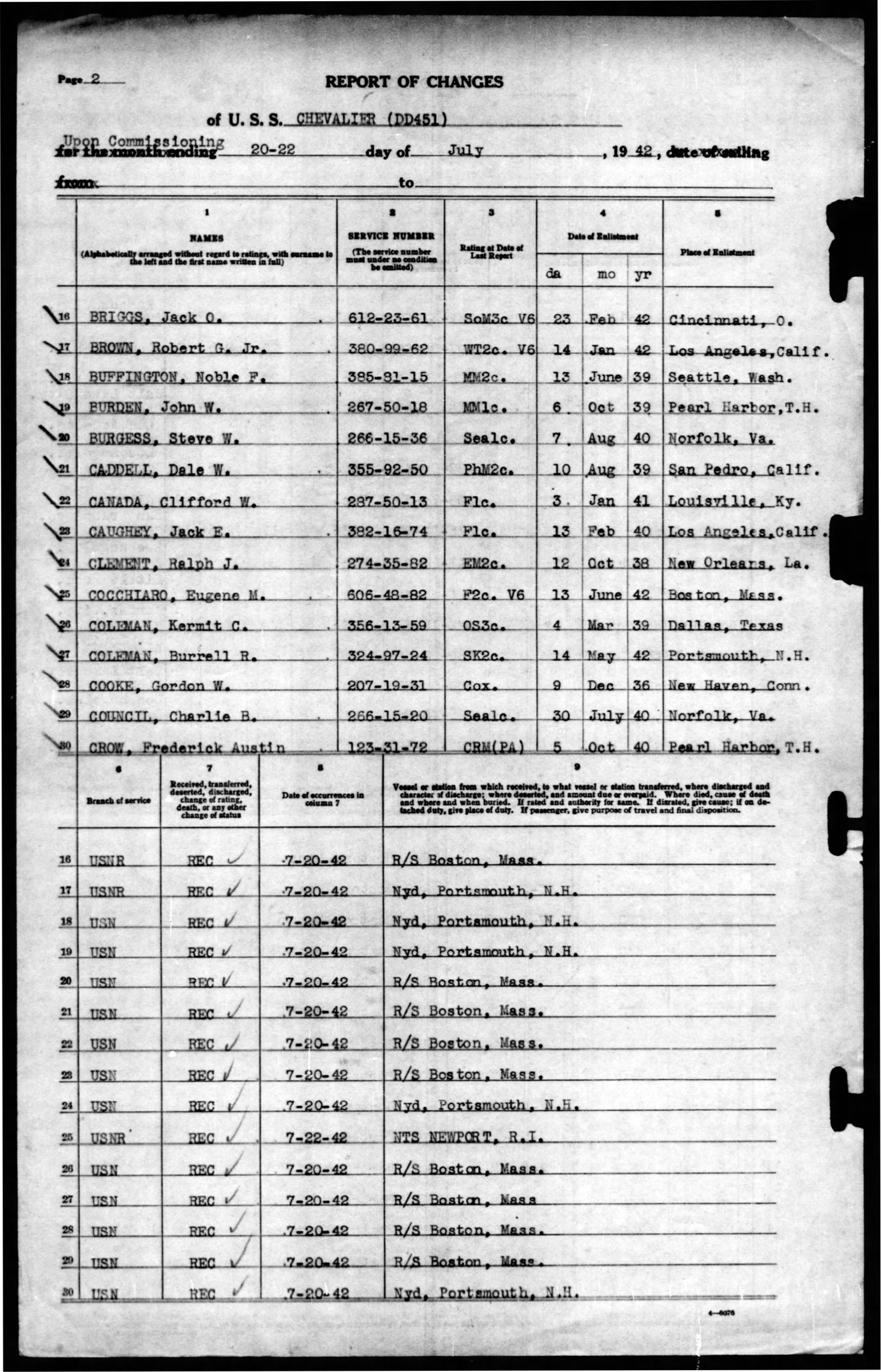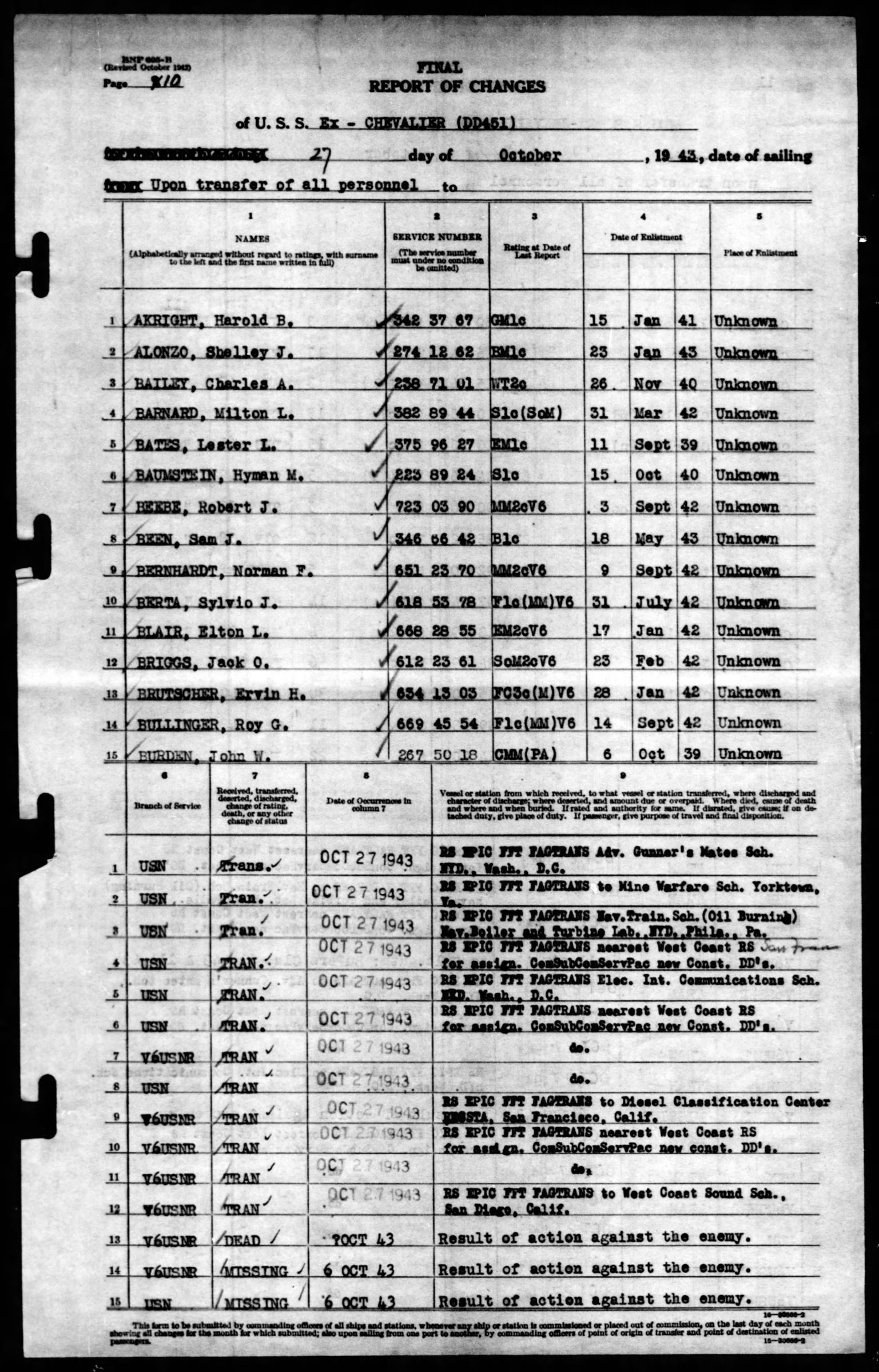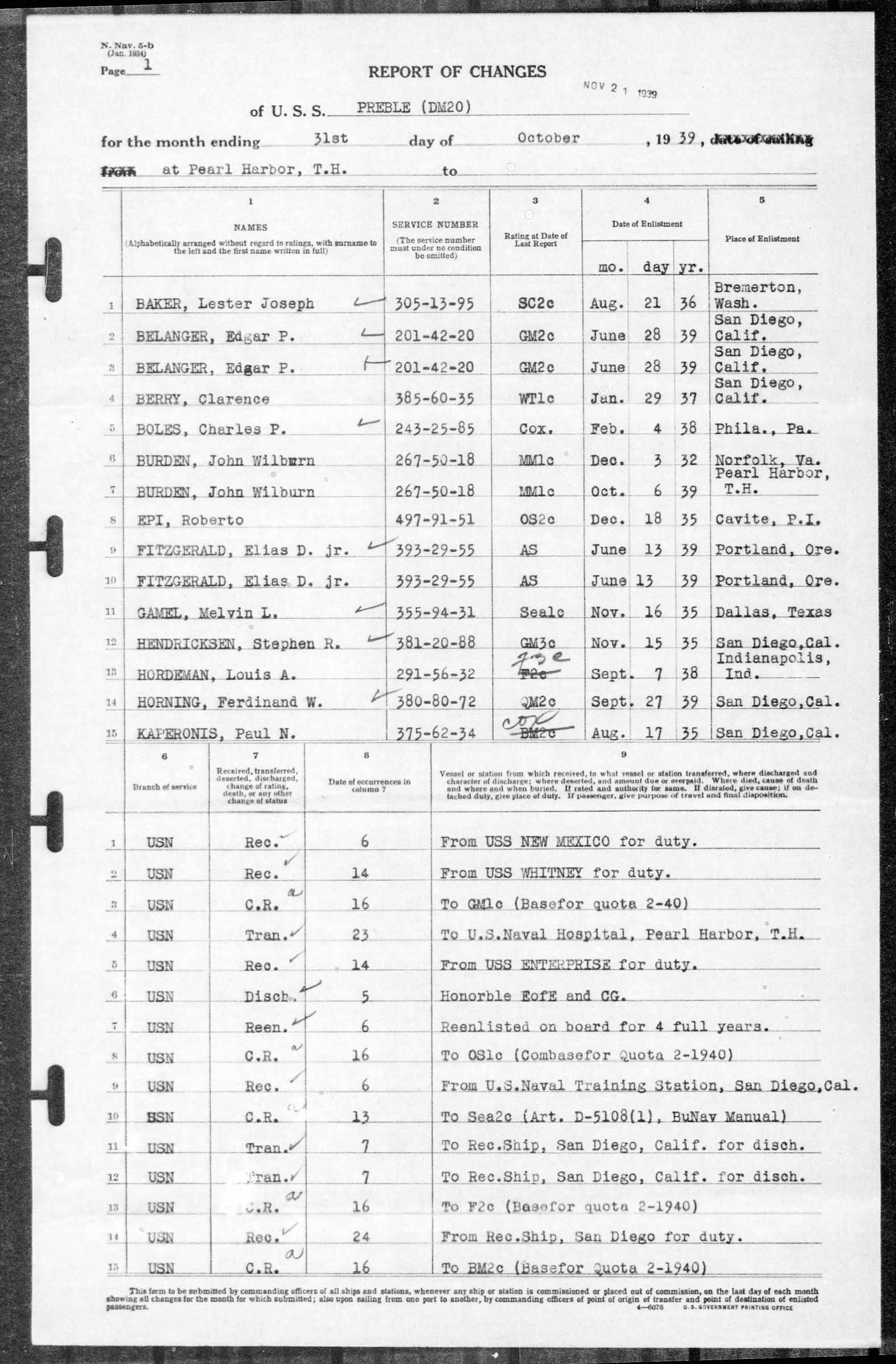 John Burden entered the service from Hawaii. He served on the U.S.S. Whippoorwill and was transferred to the U.S.S. Preble (DM20) on 20 September 1939. He was honorable discharged while at Pearl Harbor on the Preble on 5 October 1939 and reenlisted the next day on board for 4 full years. On 20 July 1942 he was transferred to the U.S.S. Chevalier (DD451). On 3 October 1943 he agreed to extend enlistment for the period of years while on board of the Chevalier. He was missing in action on 6 October 1943 as a result of action against the enemy. He was officially declared dead on 7 October 1944.