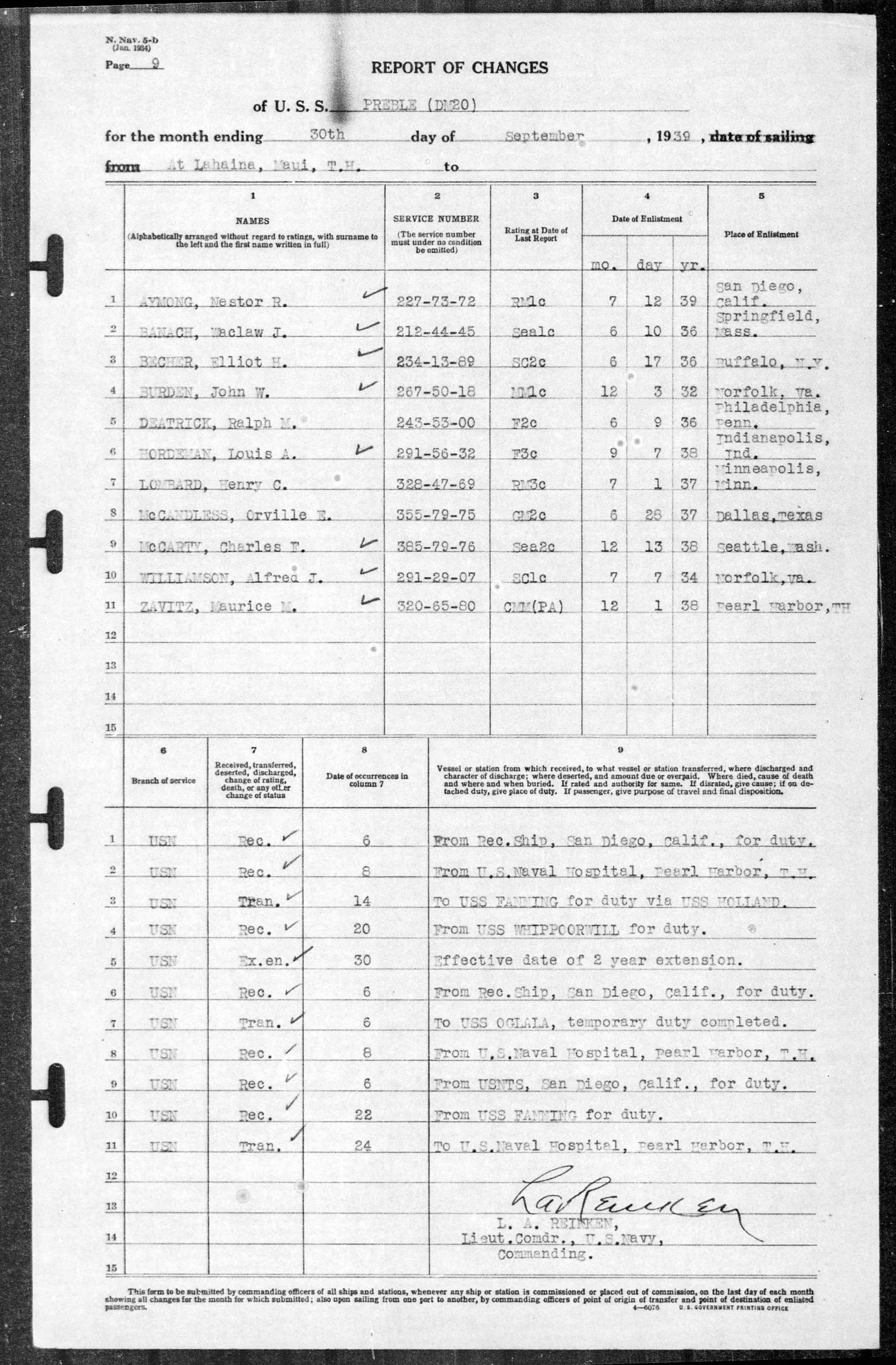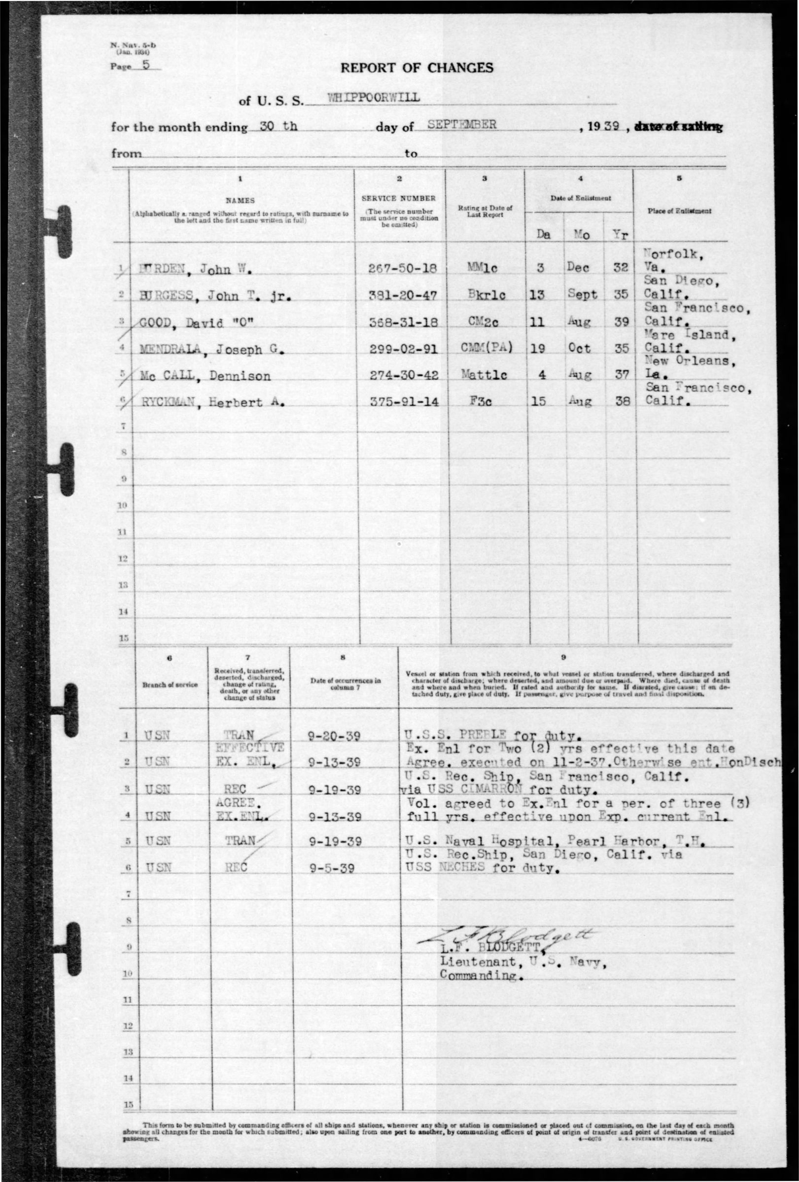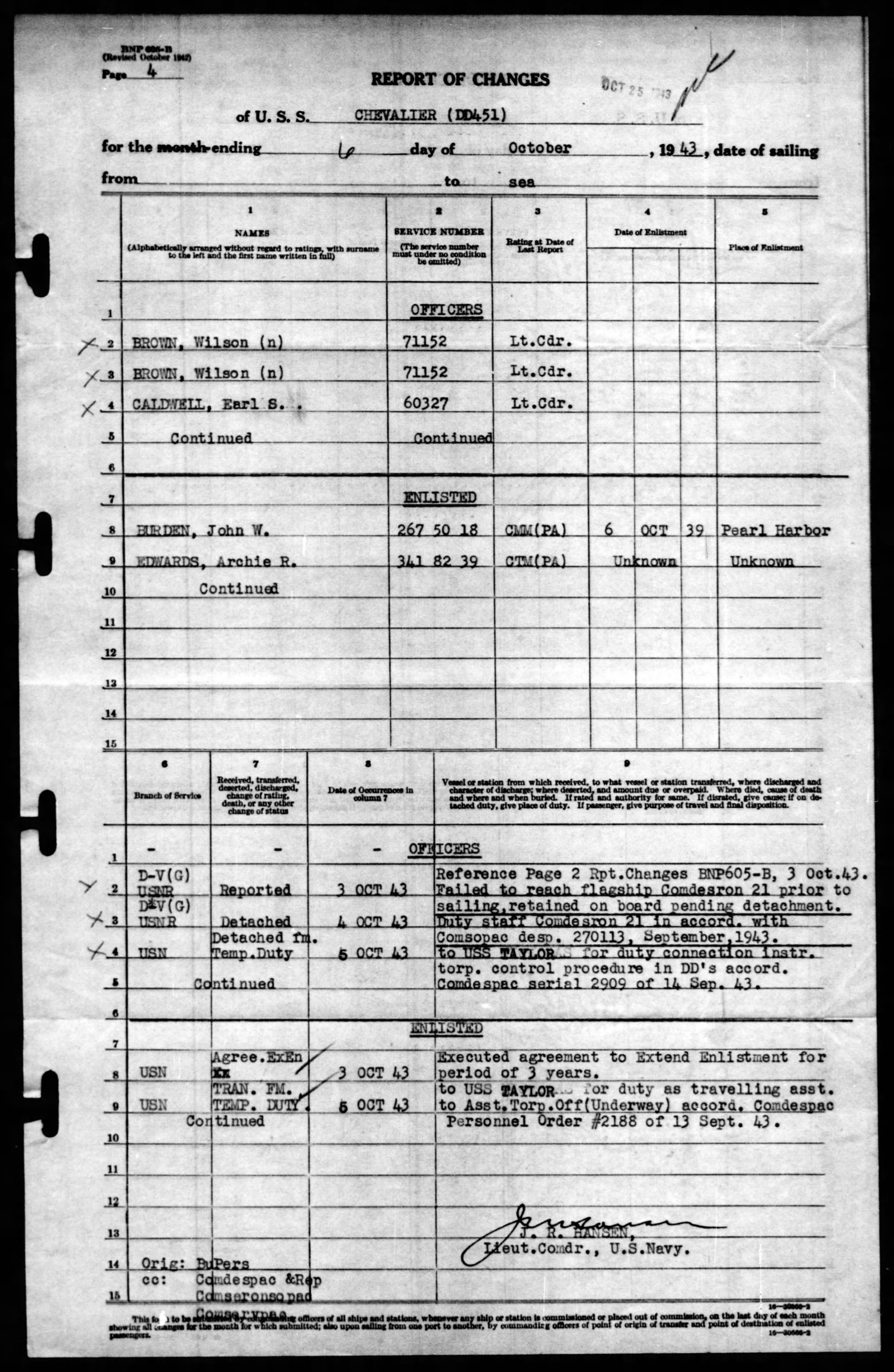 John Burden entered the service from Hawaii. He served on the U.S.S. Whippoorwill and was transferred to the U.S.S. Preble (DM20) on 20 September 1939. He was honorable discharged while at Pearl Harbor on the Preble on 5 October 1939 and reenlisted the next day on board for 4 full years. On 20 July 1942 he was transferred to the U.S.S. Chevalier (DD451). On 3 October 1943 he agreed to extend enlistment for the period of years while on board of the Chevalier. He was missing in action on 6 October 1943 as a result of action against the enemy. He was officially declared dead on 7 October 1944.