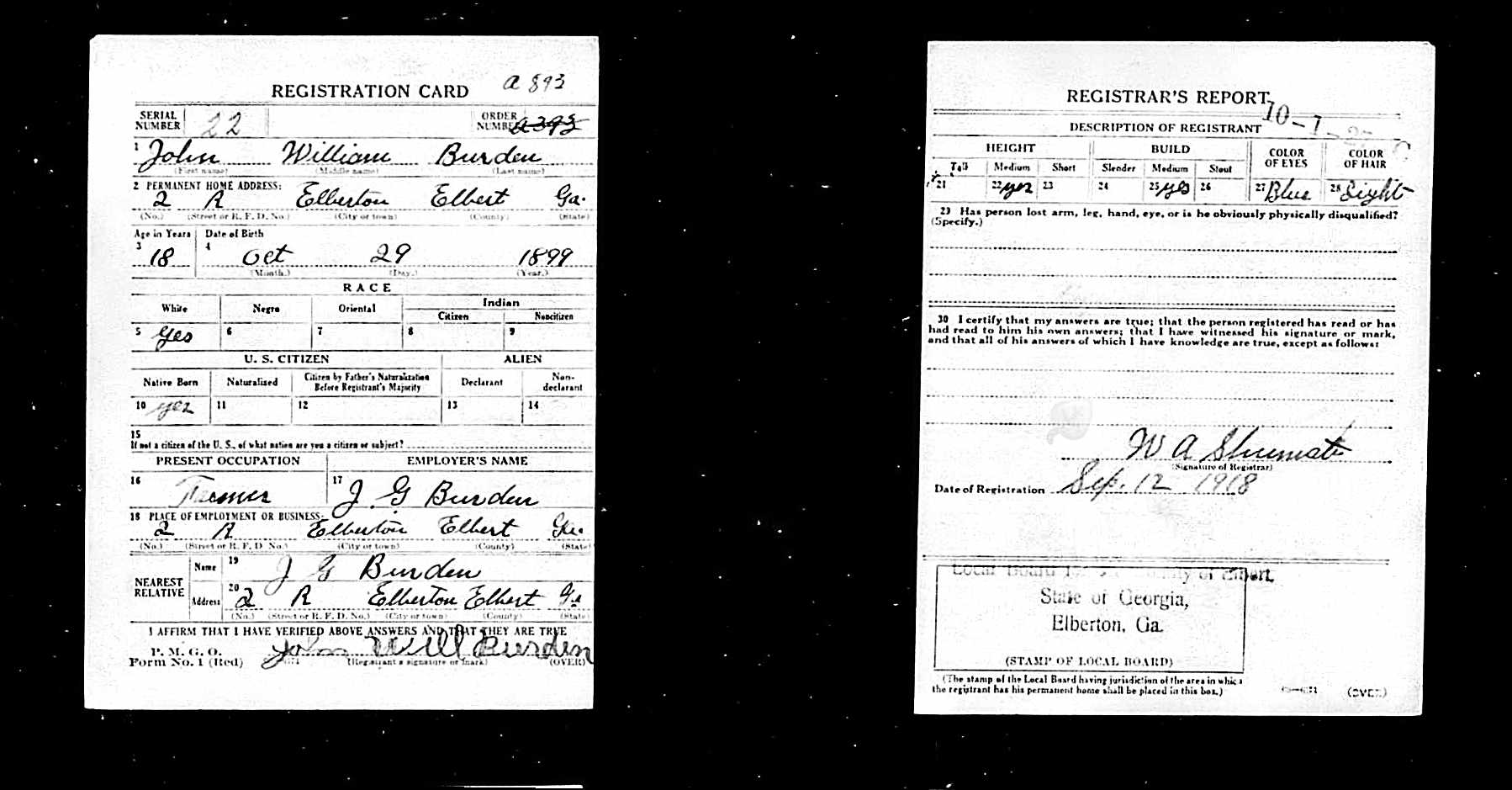John William Burden was born in Elbert County, Georgia. Son of John Gipson Burden and Ramie Vistula. He was married to Emma Nell Greenway. Children: Dolores Marie Burden and John Dale Burden, Kurt Wilburn Bocian.