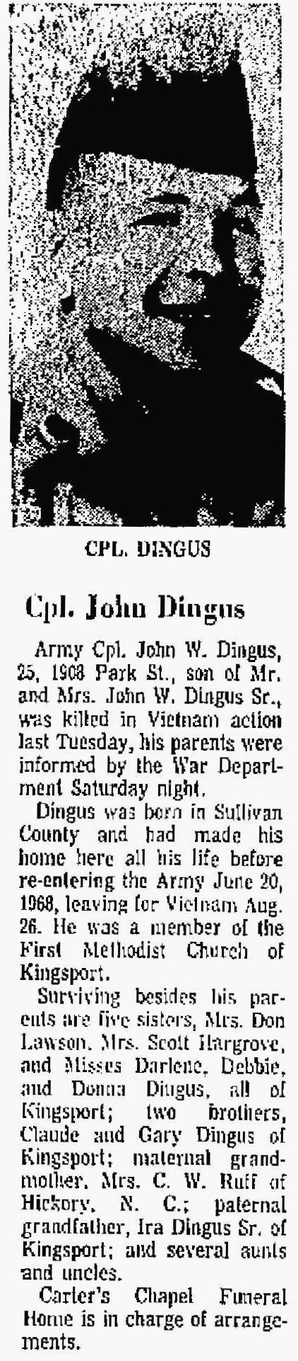 Army Private First Class John W. Dingus Jr, son of Mr and Mrs John W. Dingus Sr 1908 Park St, has been killed in Vietnam action, his parents were informed by the War Department last night. The 22 year old victim died Oct 1. His parents have not yet been told where he was killed. Pvt Dingus re-enlisted in the Army in June. He left for Vietnam from Camp Lewis in Washington in August. His parents were informed early Saturday morning that he was missing in action, and confirmation of his death came about 10 hours later. Dingus was born in Sullivan County and made his home here all his life before re-entering the Army Jun 20, 1968, leaving for Vietnam on Aug 26. He was a member of the Methodist Church of Kingsport. Surviving besides his parents are five sisters, Mrs Don Lawson, Mrs Scott Hargrove, and Misses Darlene, Debbie and Donna Dingus all of Kingsport maternal grandmother Mrs C.W. Ruff of Hickory, NC Paternal grandfather, Ira Dingus Sr of Kingsport and several aunts and uncles.