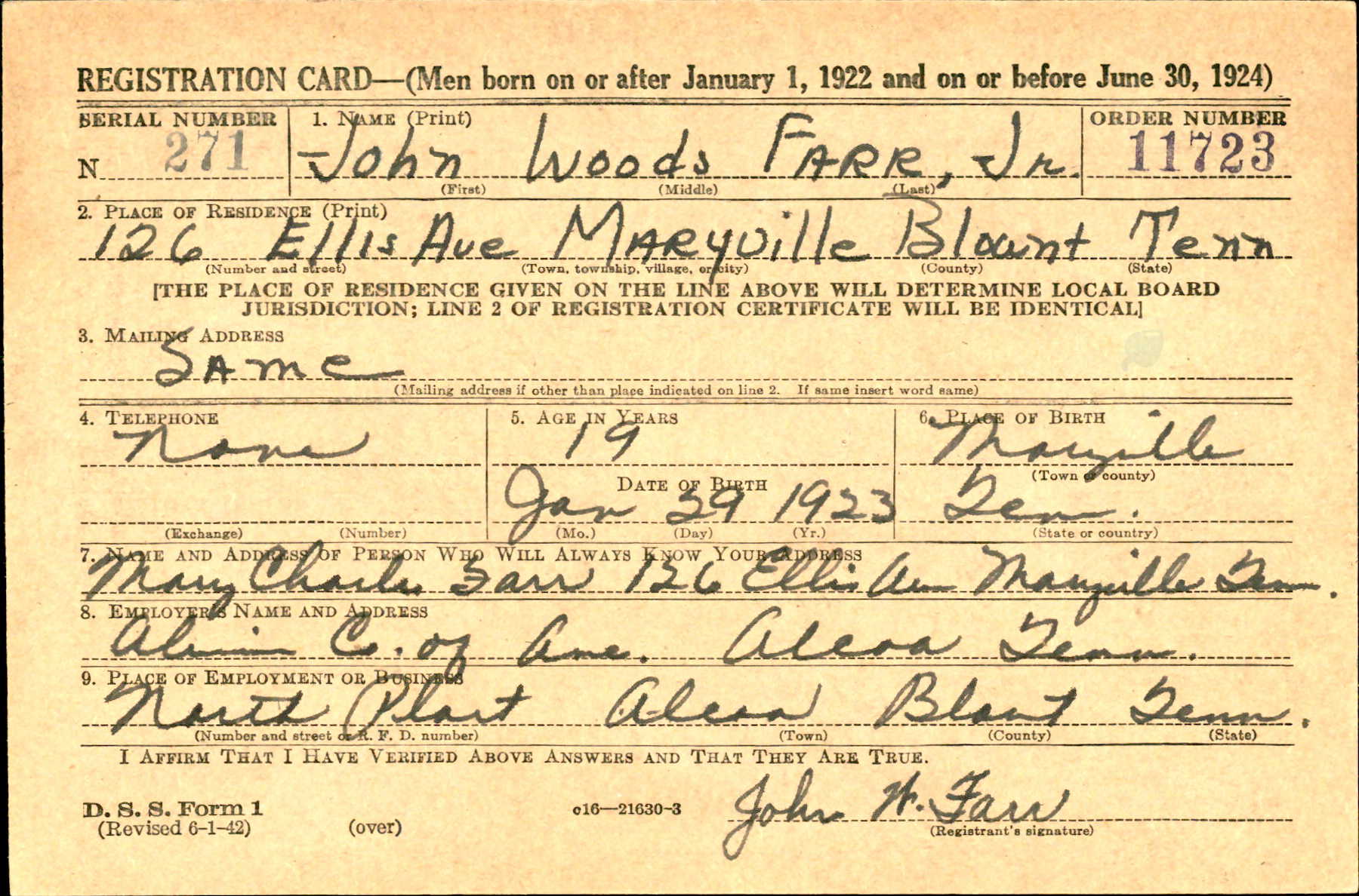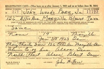 John Woods Farr was the son of John Woods Farr and Susan Virginia Russell. He graduated at Maryville High School in 1941.