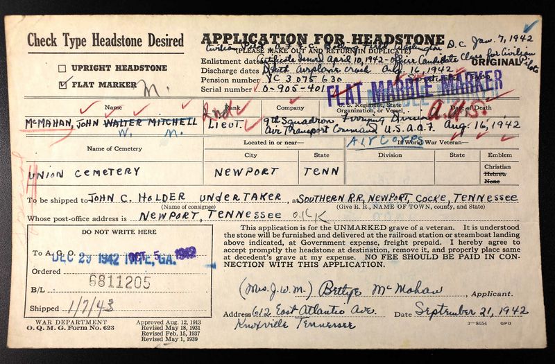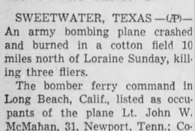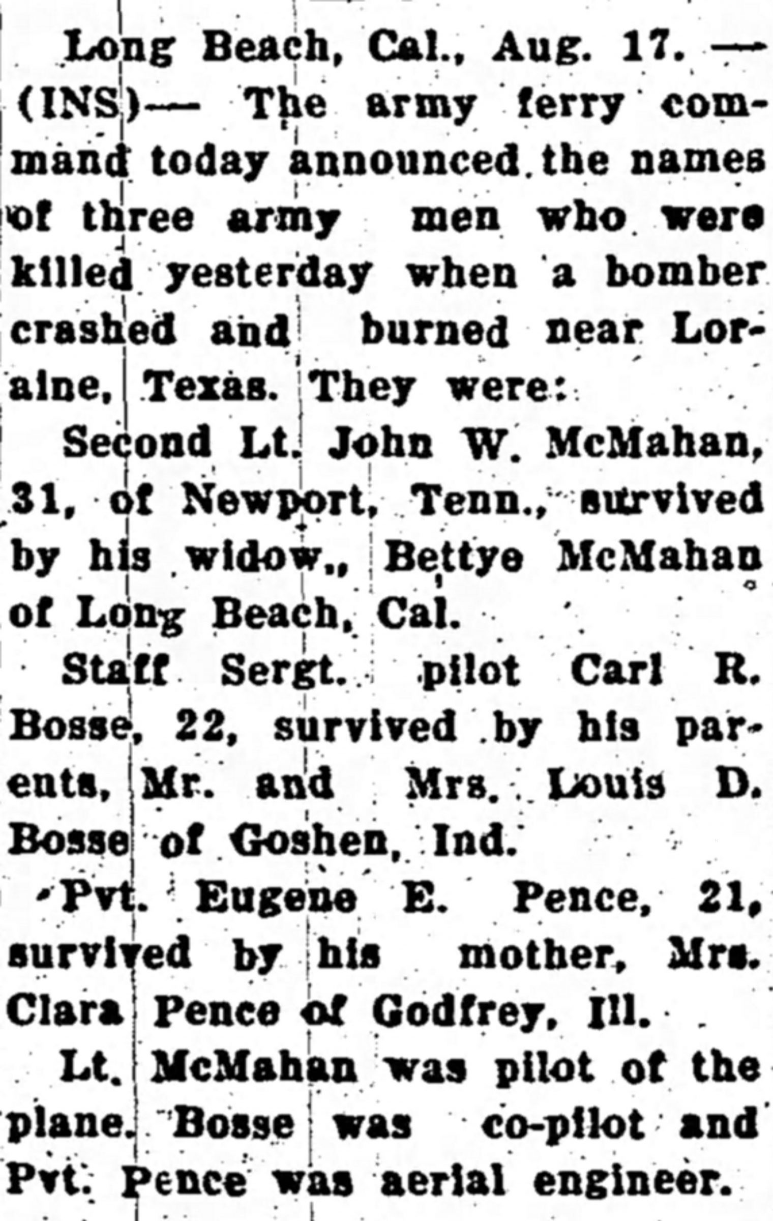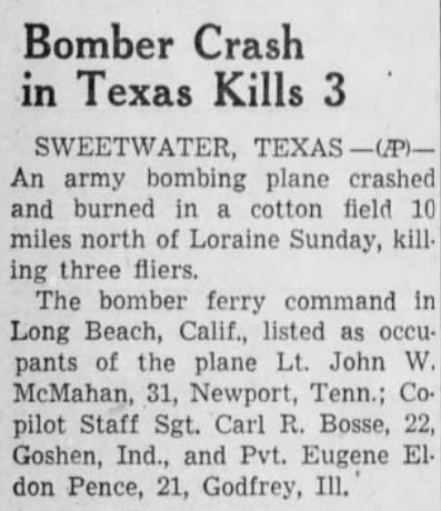 Sweetwater, Texas – An army bombing plane crashed and burned in a cotton field 10 miles north of Loraine, Sunday, killing three fliers. The bomber ferry command in Long Beach, Calif., listed as occupants of the plane Lt. John W. McMahan, 31, Newport, Tenn.; Co-pilot Staff Sgt. Carl R. Bosse, 22, Goshen, Ind., and Pvt. Eugene Eldon Pence, 21, Godfrey, Ill.