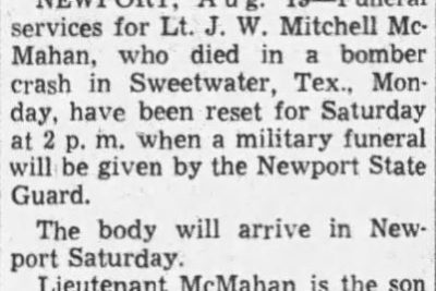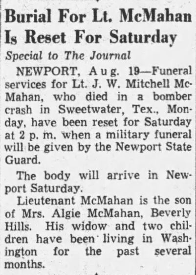 Funeral services for Lt. J.W. Mitchell McMahan, who died in a bomber crash in Sweetwater, Texas., Monday, have been reset for Saturday at 2 p.m. when a military funeral will be given by the Newport State Guard. The body will arrive in Newport Saturday. Lieutenant McMahan is the son of Mrs. Algie McMahan, Beverly Hills. His widow and two children have been living in Washington for the past several months.