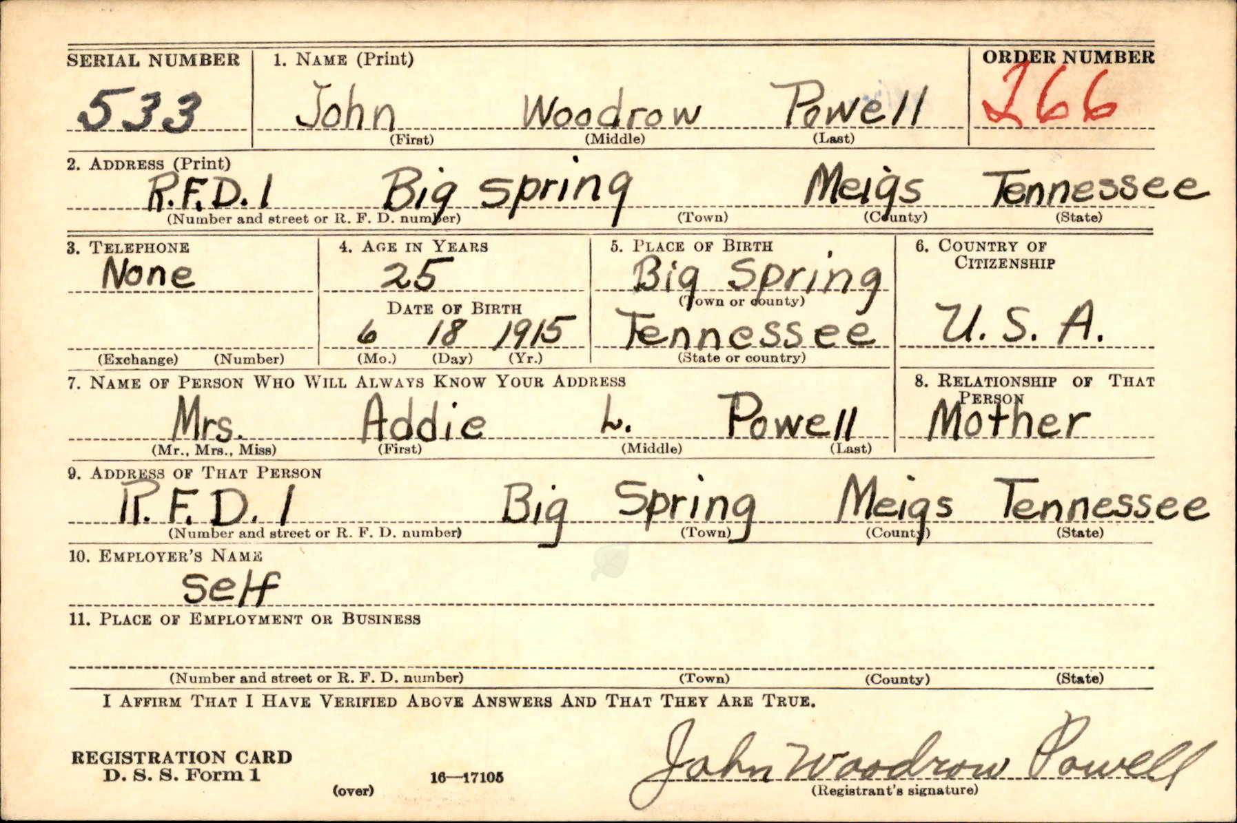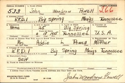 John Woodrow “Bill” Powell was born in Big Spring, Tennessee, the son of John W. Powell and Addie Lou Masoner.