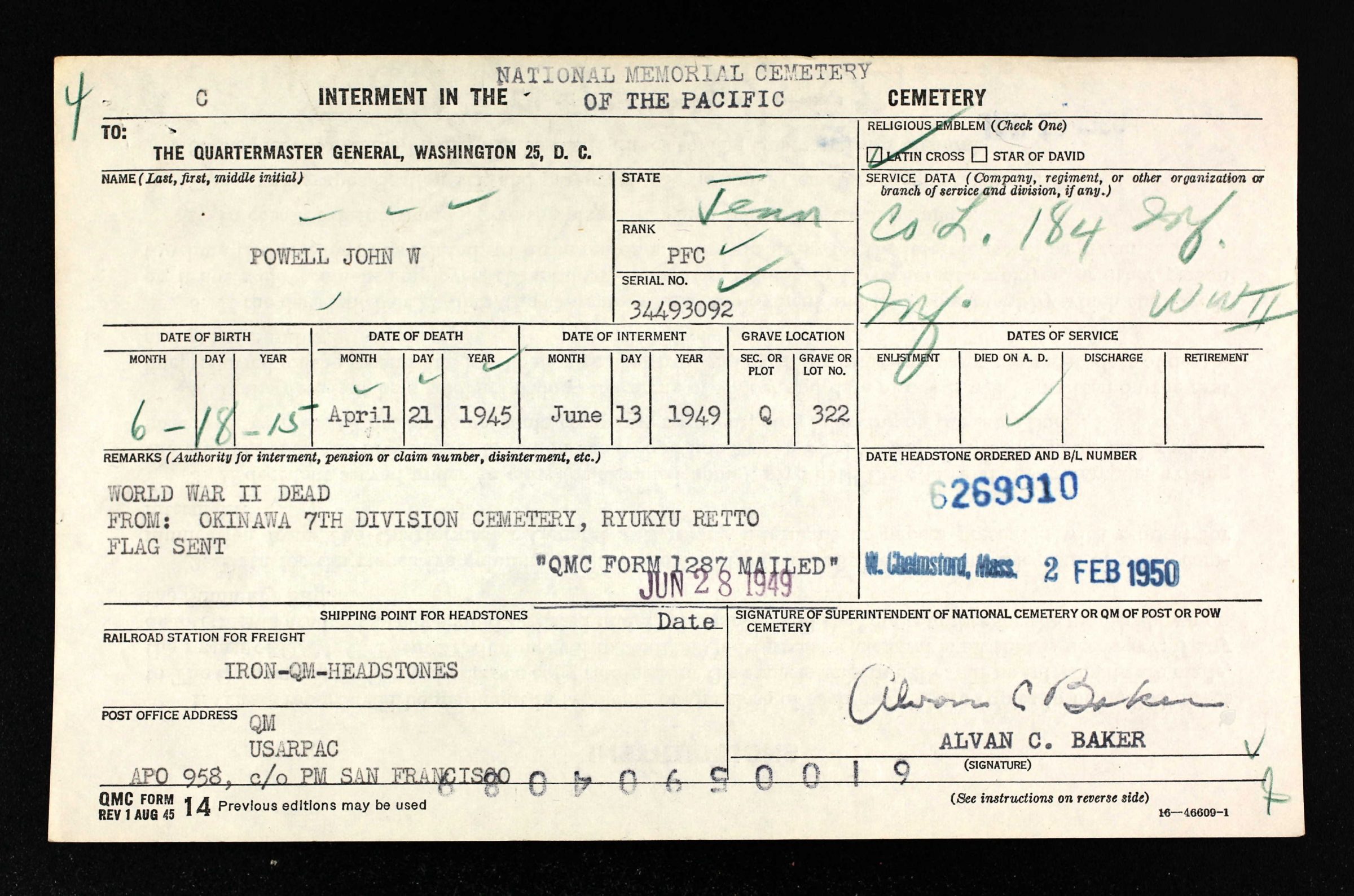 Buried at Honolulu Memorial, HI, Q, 322