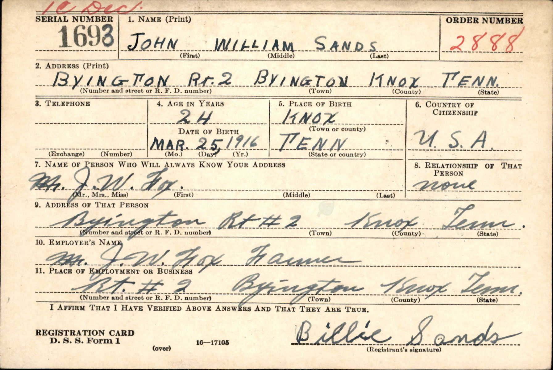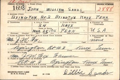 John William Sands was the son of Samuel F. Sands and Bessie Lou Eubanks. Siblings: Ruby M. Sands, Horace Furman Sands, Rose Evelyn Sands and Lillie Gertrude Sands