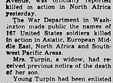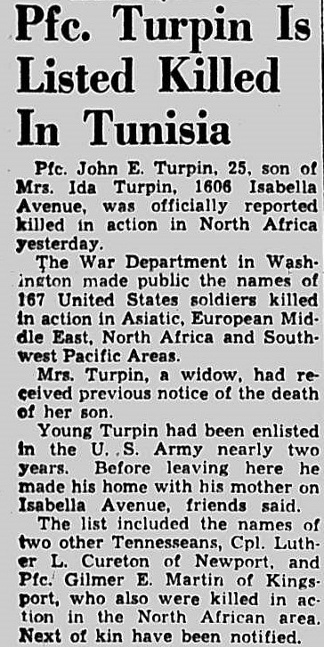 Pfc. John E. Turpin, 25, son of Mrs. Ida Turpin, 1606 Isabella Avenue, was officially reported killed in action in North Africa yesterday. The War Department in washington made public the names of 167 United States soldiers kille din action in Asiatic, European Middle East, North Africa and South-west Pacific Areas. Mrs. Turpin, a widow, had received previous notice of the death of her son. Young Turpin had been enlisted in the U.S. Army nearly two years. Before leaving here he made his home with his mother on Isabella Avenue, friends said.