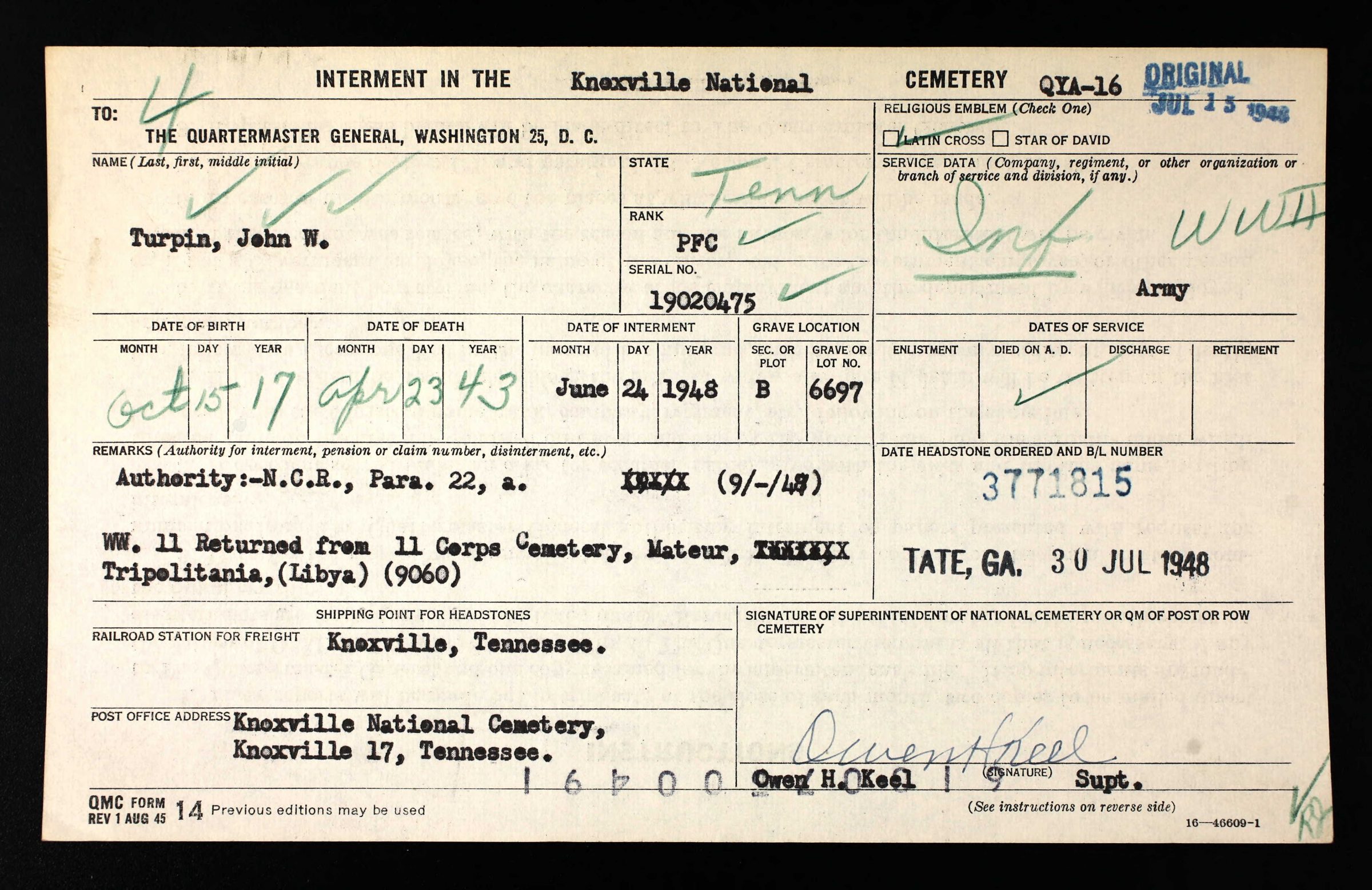 PFC Turpin was initially buried at 11 Corps Cemetery, Matuer, Tripolitania in Libya.