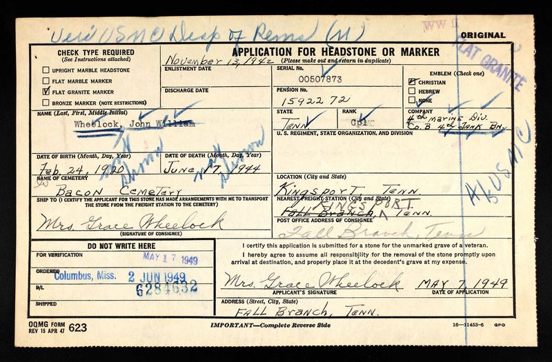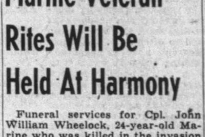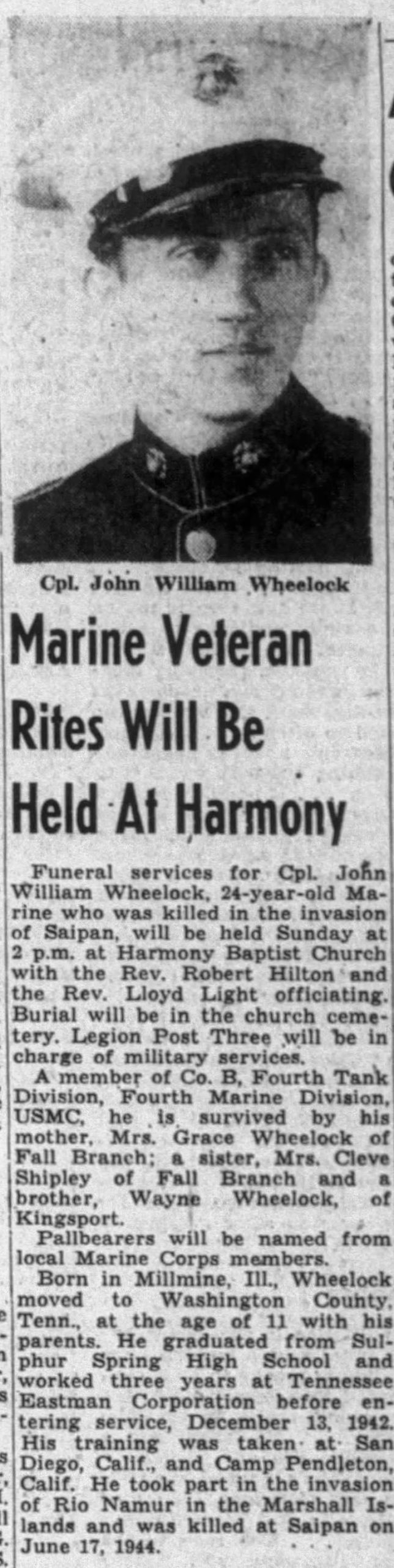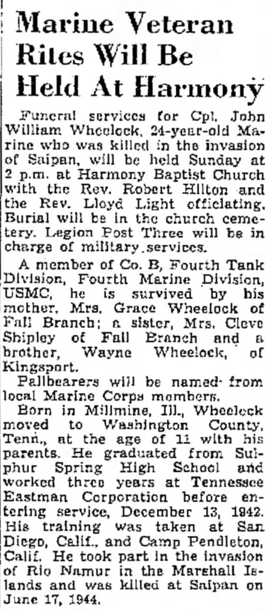 Funeral services for Cpl. John William Wheelock, 24-year-old Marine who was killed in the invasion of Saipan, will be held at Harmony Baptist Church. Burial will be in the church cemetery. A member of Co. B, Fourth Tank Division, Fourth Marine Division, USMC, he is survived by his mother, Mrs. Grace Wheelock of Fall Branch, a sister, Mrs. Cleve Shipley of Fall Branch and a brother, Wayne Wheelock of Kingsport. Born in Millmine, Ill., Wheelock moved to Washington County, Tenn., at a age of 11 with his parents. He graduated from Sulphur High School and worked three years at Tennessee Eastman Corporation before entering service, December 13, 1942. His training was taken at San Diego, Calif., and Camp Pendleton, Calif. He took part in the invasion of Rio Namur in the Marshall Islands and was killed at Saipan on June 17, 1944.