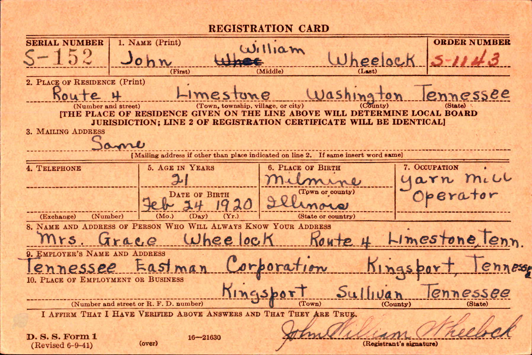John William Wheelock was born on 24 February 1920 in Millnime, Illinois, the son of Nathan Oscar Wheelock and Grace Wagoner.