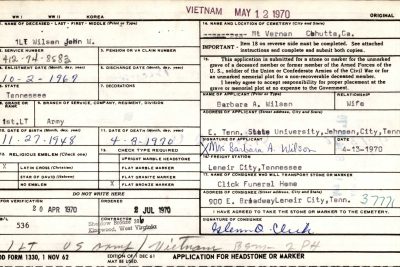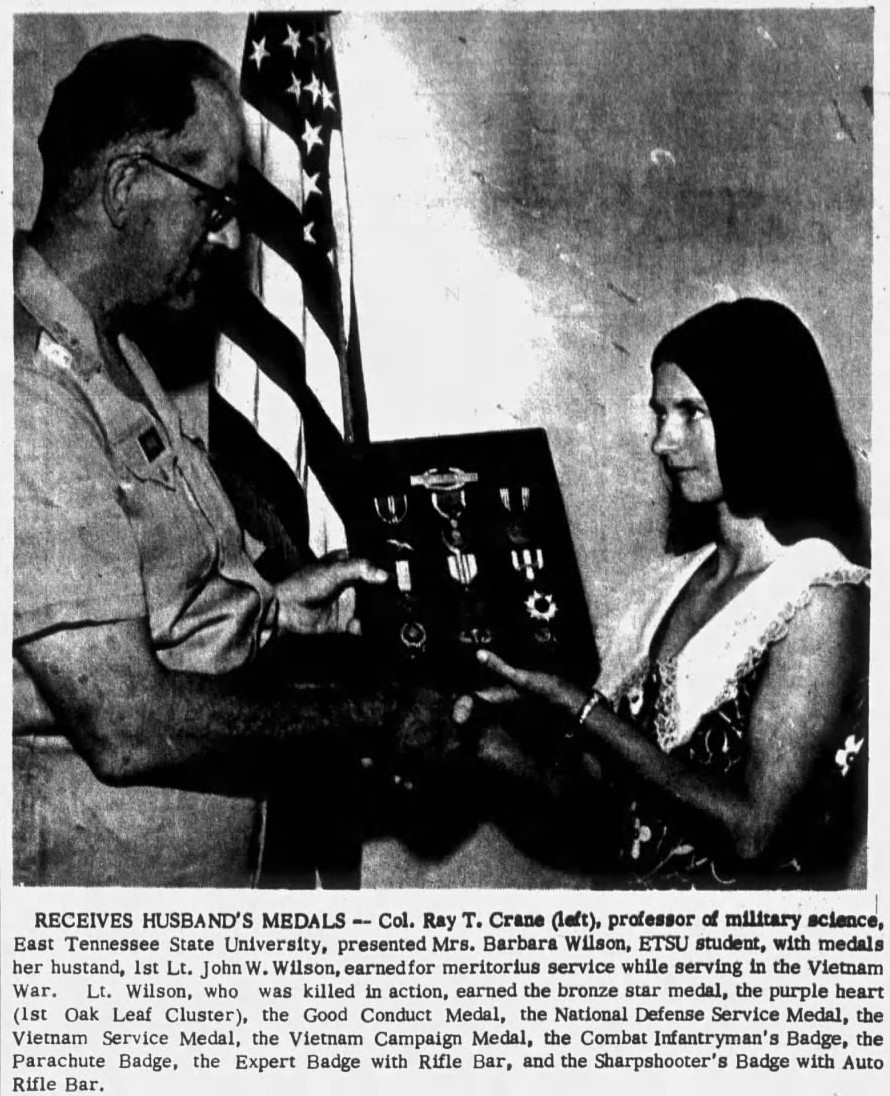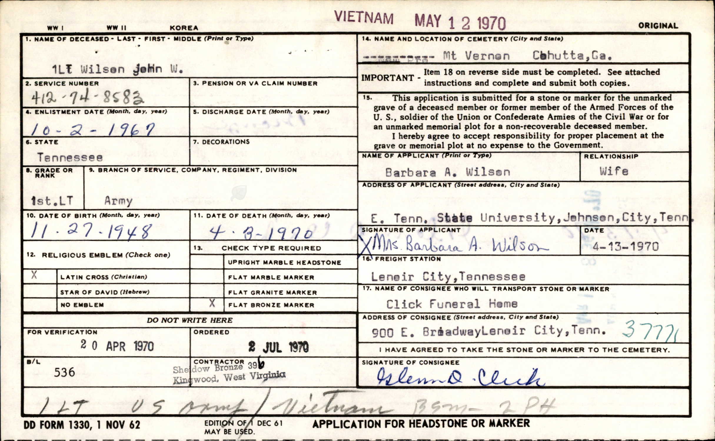 1st Lieutenant John William “Bill” Wilson was born on November 27, 1948, and was originally from Loudon, Tennessee. He was the son of John Webb and Mary Wilson He married Barbara Ann Davis in 1967.