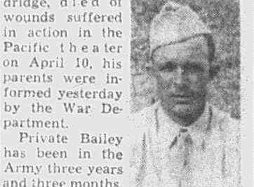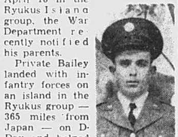 Private Bailey landed with infantry forces on an island in the Ryukus group – 365 miles from Japan – on D-Day and helped establish beach heads at Makin in the Gilbert Islands. He also participated in the conquest of Saipan Island. Entering service about three years ago, Bailey has served overseas for more than two years. He took training in South Carolina. He was a farmer prior to entering the service.