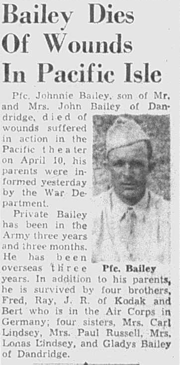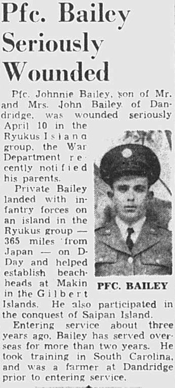 Pfc. Johnnie Bailey, son of Mr. and Mrs. John Bailey of Dandridge, was wounded seriously April 10 in the Ryukus Island group, the War Department recently notified his parents.