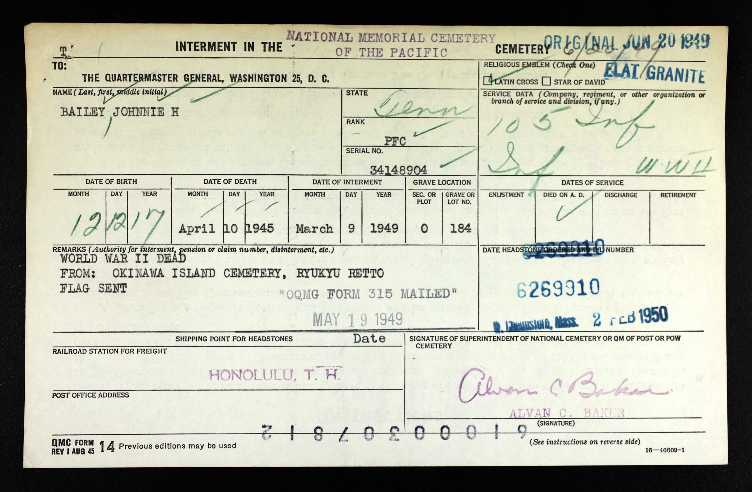 Buried at Honolulu Memorial, HI, Plot 0, Grave 184. He was returned from Okinawa Island Cemetery, Ryukyu Retto.