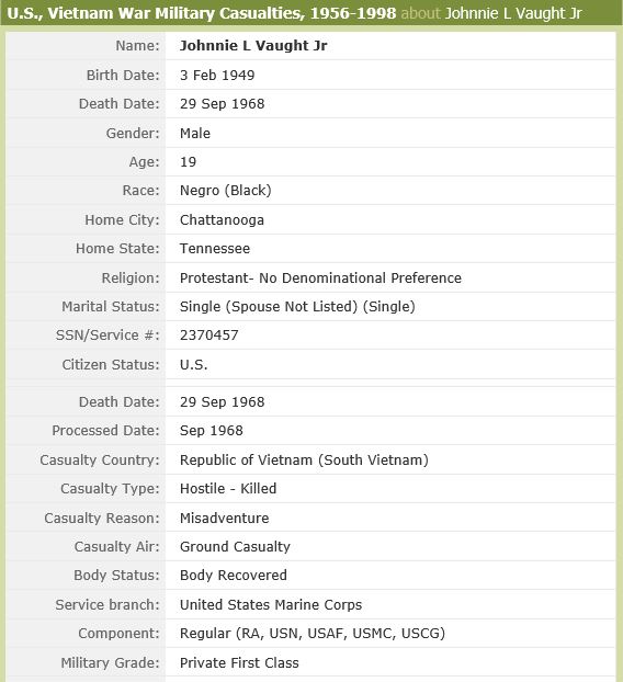 Private First Class Johnnie L. Vaught, Jr. was born on February 3, 1949, and was originally from Chattanooga, Tennessee. He served his country in the viet War in the United States Marine Corps, as a rifleman in 3rd CAG, Combined Action, III MAF. He began his tour of duty in Vietnam on January 16, 1968. On September 29, 1968, PFC Vaught was killed as a result of a friendly fire accident in Thua Thien province, South Vietnam . He was a recipient of the Purple Heart medal. PFC Vaught is buried at Chattanooga National Cemetery in Chattanooga, Tennessee, Qq, 613, and is memorialized on the Vietnam Veterans Memorial on Panel 42W, Line 44.