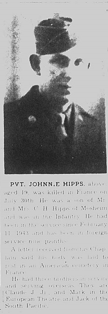 Pvt Johnnie Hipps, aged 19, was killed in France on July 30th. He was the son of Mr. and Mrs. C.H. Hipps of Mosheim and was in the Infantry. He had been in the service since February 14, 1943 and has been in foreign service nine months. A letter received from his Chaplain said his body was laid to rest in an American cemetery in France. He had three brother in the service and serving overseas. They are Claude J. Jr. and Mack in the European Theatre and Jack in the South Pacific.