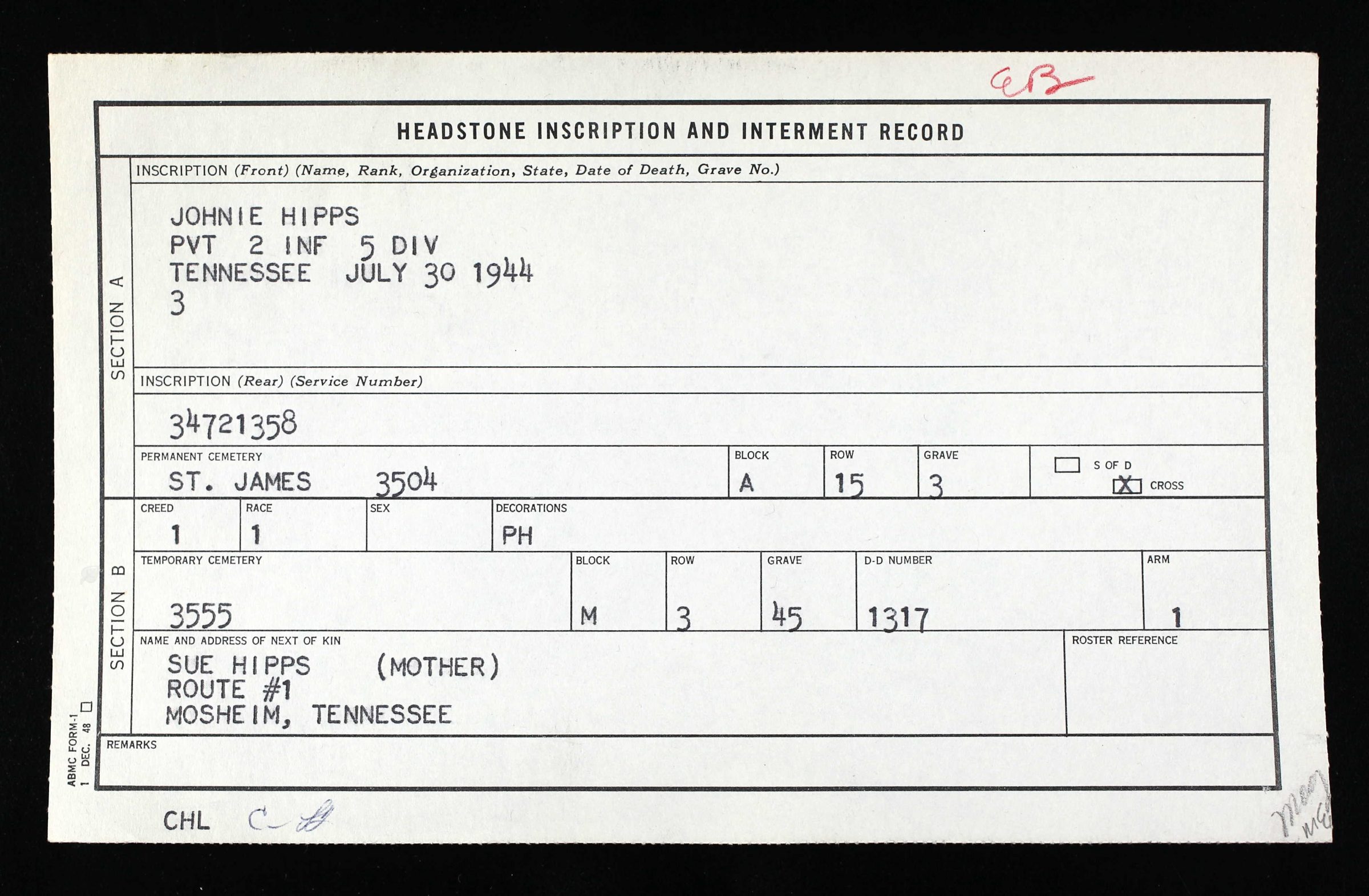 Johnny or Johnie Hipps is buried at the Brittany American Cemetery, St. James (Manche), France, A, 15, 3