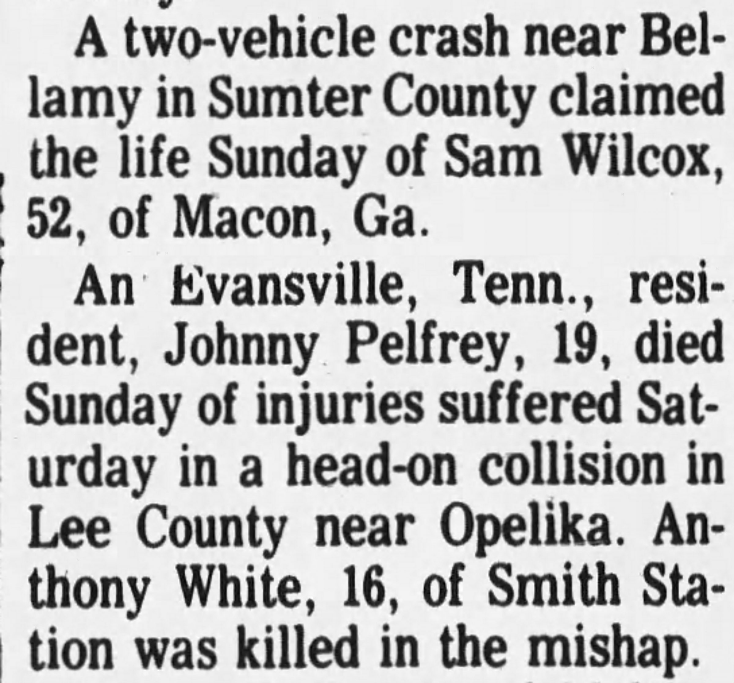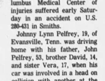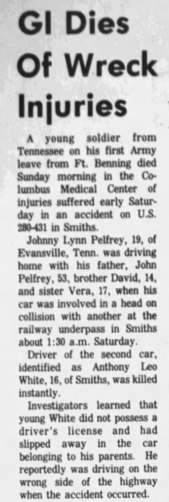 Johnny Lynn Pelfrey, 19, of Evansville, Tenn. Was driving home with his father, John Pelfrey, 53, brother David, 14 and sister Vera, 17, when his car was involved in a head on collision with another at the railway underpass in Smiths about 1:30 a.m. Saturday. Driver of the second car, identified as Anthony Leo White, 16, of Smiths, was killed instantly. Investigators learned that young White did not possess a driver’s license and had slipped away in the car belonging to his parents. He reportedly was driving on the wrong side of the highway when the accident occurred.