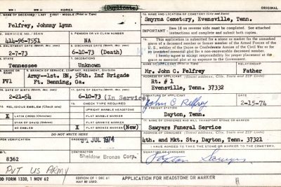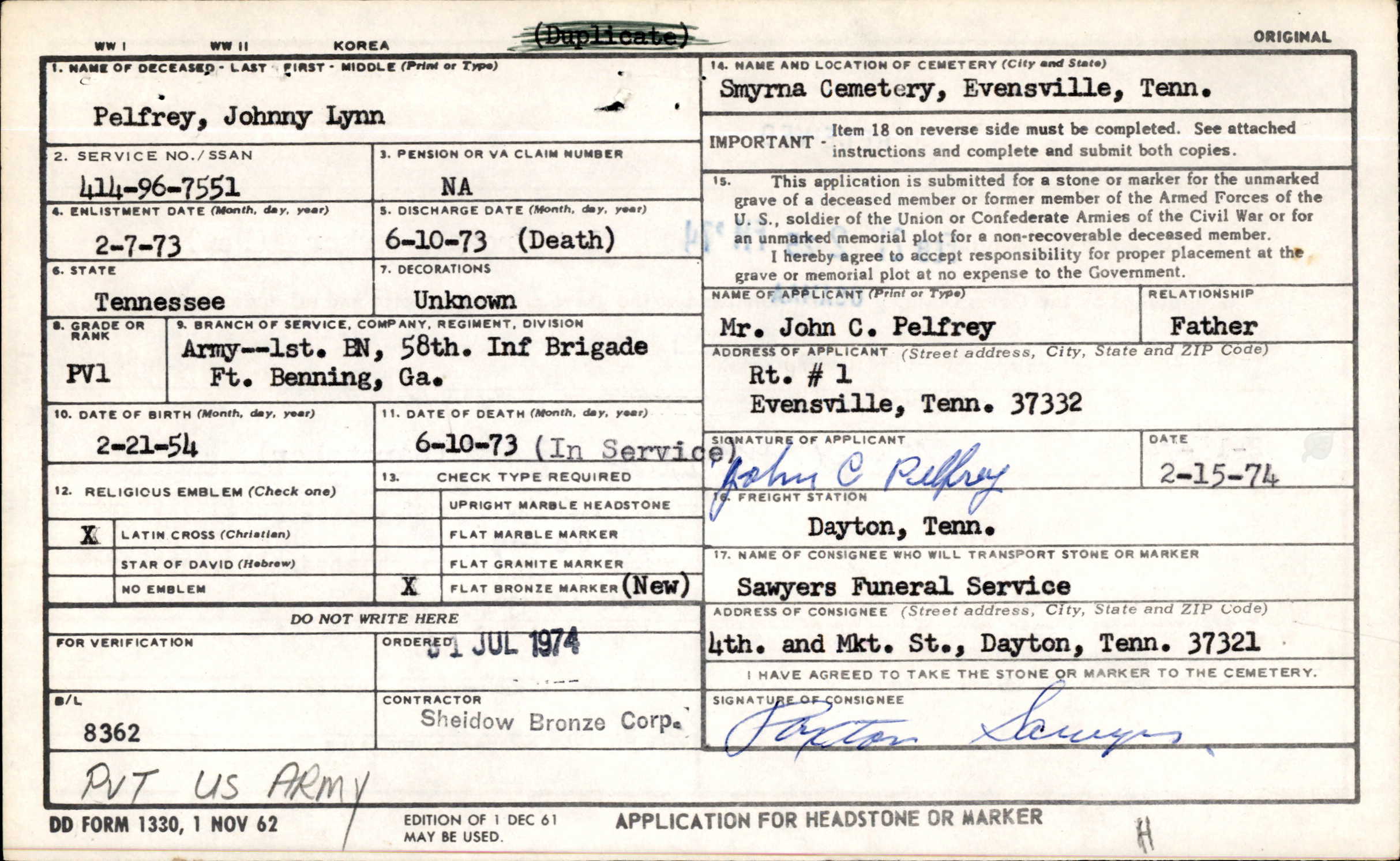 I am Johnny’s sister I was in the car accident with him in 1973. I don’t know alot about the army but I think he was a pvt in basic training he was coming home for a weekend leave my dad Clay Pelfrey my little brother David Pelfrey. And myself Vera Pelfrey now Henderson went to pick him up on our return home is when the other young man struck out car head on if you would like to talk call 423-799-0333 ask for Vera thank you very much Vera Henderson.