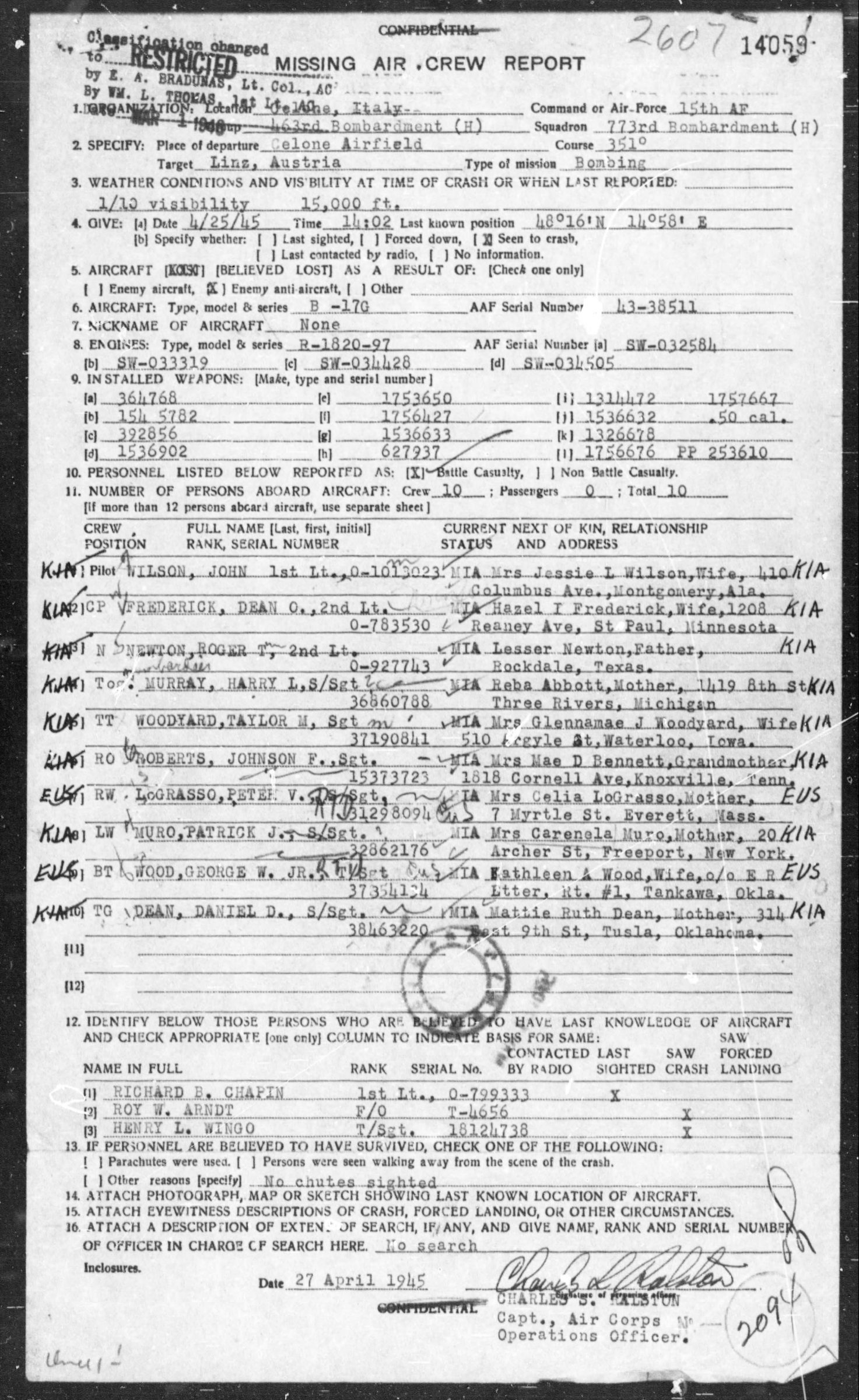As co-pilot on ship #881, Able 5, this is what I saw over the target and during the rally regarding Ship #511, Able 6: He received, according to my pilot, a direct hit in his number two engine. This was just before bombs away. Able 6 peeled off slowly to the left and dropped from my view. Flak had broken up our formation and the crew on our ship called out the location of the various ships that had left the formation and informed up as to what they were doing. As I recall 511 descended very rapidly, according to the gunners who could see him. They also called out a ship heading for Russia. As we rallied left I saw a B-17 heading straight toward Russia at approximately ten or fifteen thousand feet. It crossed a river and began to turn left very slowly. Thinking the pilot was heading the ship for enemy territory and bailing out the crew, I suggested the crew watch closely for chutes. Just before completing a 180 degree turn the ship exploded, blowing off one wing. It began to roll very rapidly and both parts burned as they spun toward the ground. I recall seeing fire on the ground, but not the actual crash.