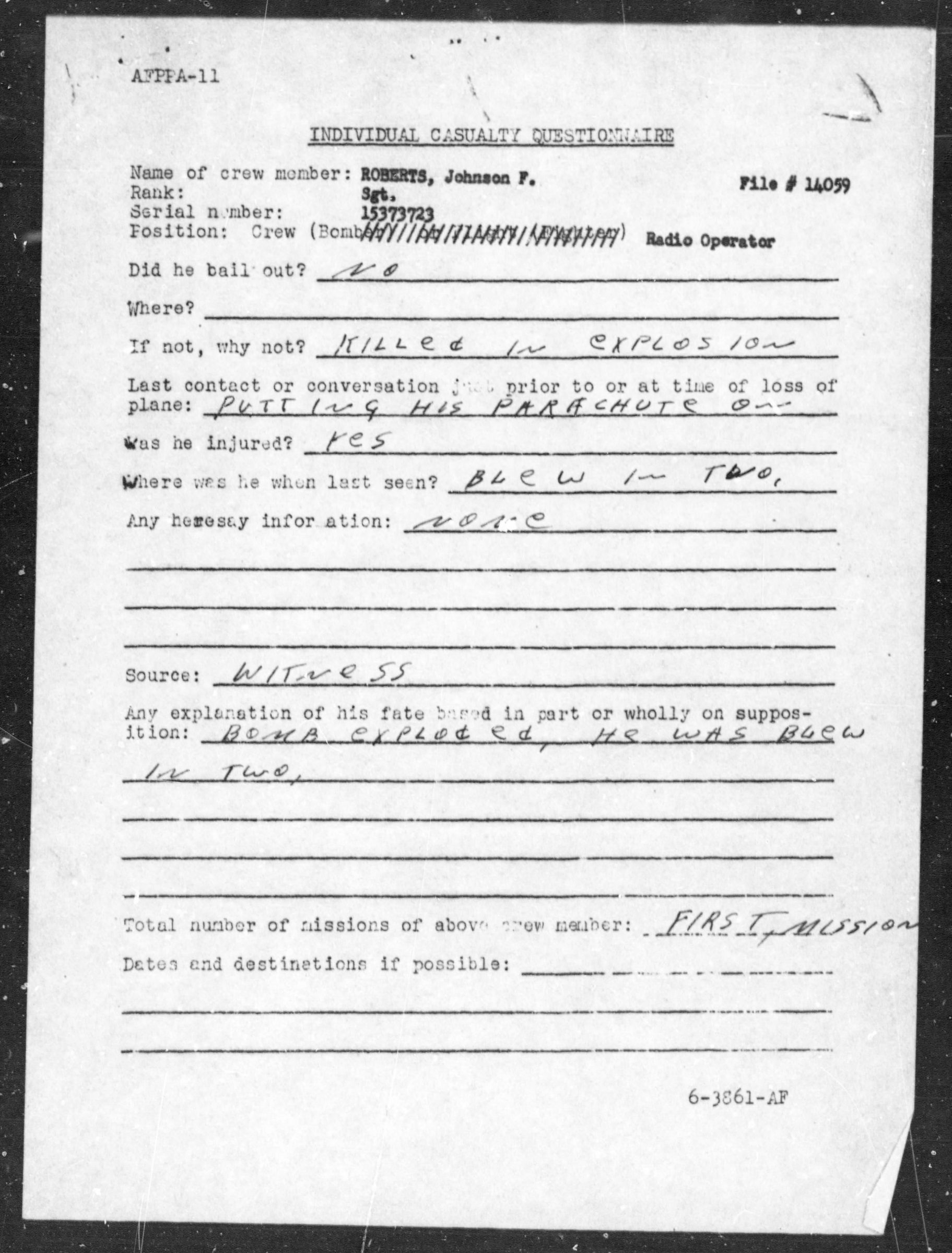 Sgt Roberts didn’t bail out. He was last seen putting on his parachute and was killed in the explosion.