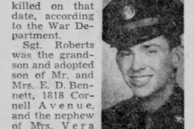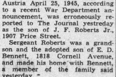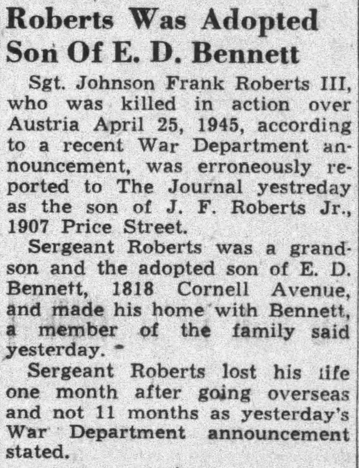 Sgt. Johnson Frank Roberts III, who was killed in action over Austria April 25, 1945, according to a recent War Department announcement, was erroneously reported to The Journal yesterday as the son of J.F. Roberts Jr., 1907 Price Street. Sergeant Roberts was a grandson and the adopted son of E.D. Bennett, 1818 Cornell Avenue and made his home with Bennett, a member of the family said yesterday. Sergeant Roberts lost his life one month after going overseas and not 11 months as yesterday’s War Department announcement stated.