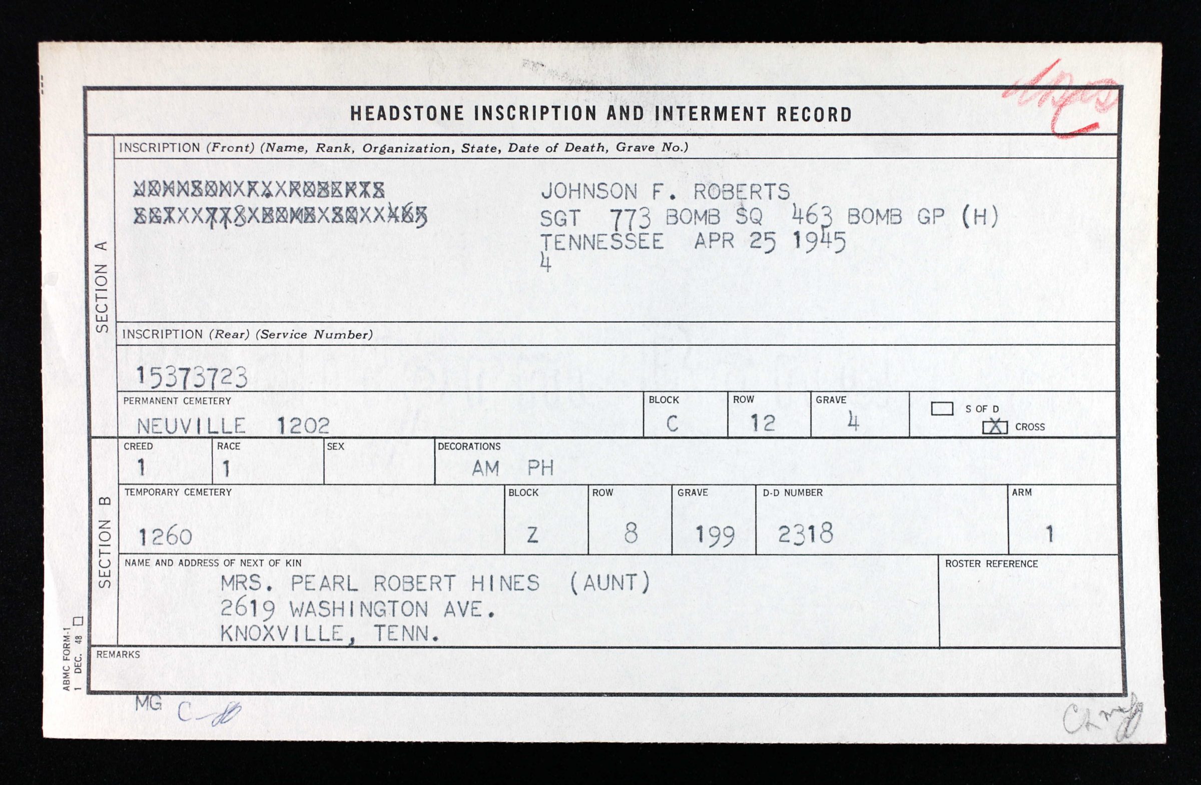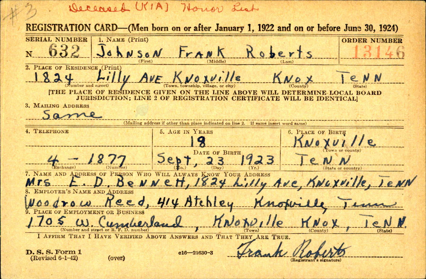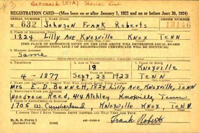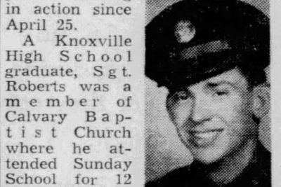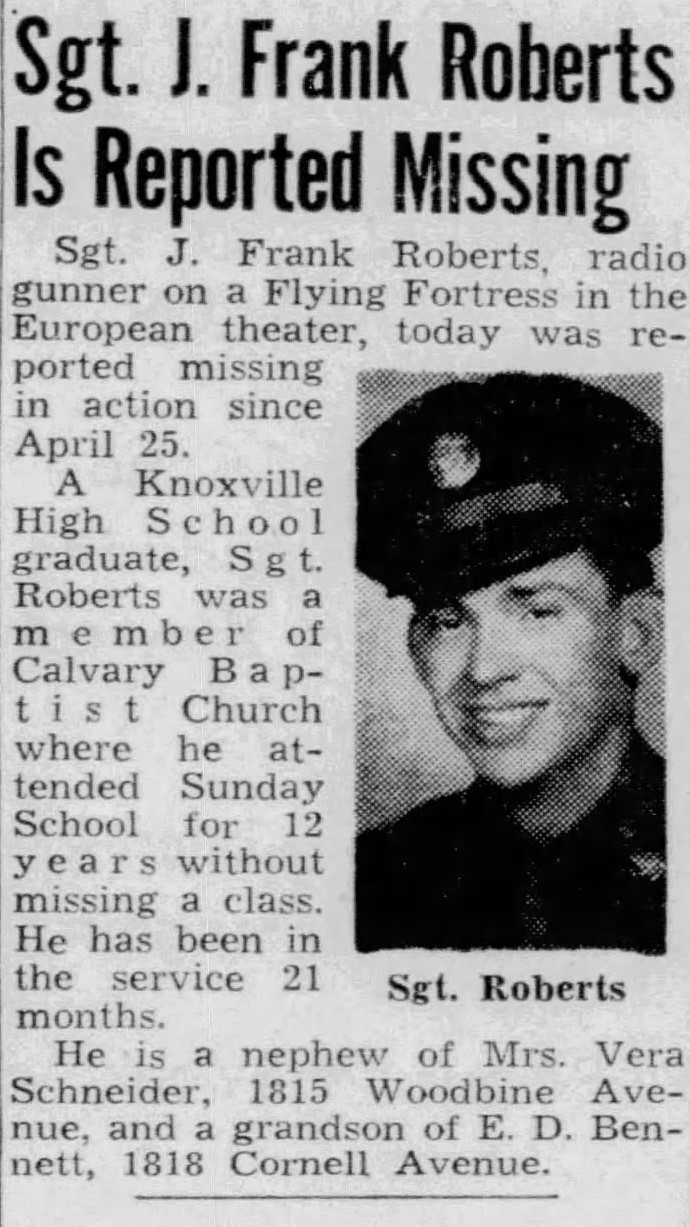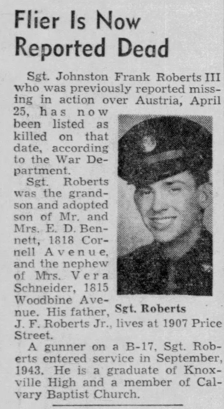 Sgt. Johnston Frank Roberts III who was previously reported missing in action over Austria, April 25, has now been listed as killed on that date, according to the War Department. Sgt. Roberts was the grandson and adopted son of Mr. and Mrs. E.D. Bennett and the nephew of Mrs. Vera Schneider, 1815 Woodbine Avenue. His father, J.F. Roberts Jr., lives at 1907 Price Street. A gunnero n a B-17, Sgt Roberts entered service in September, 1943. He is a graduate of Knoxville High School and a member of Calvary Baptist Church.