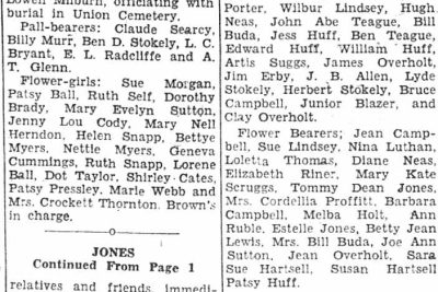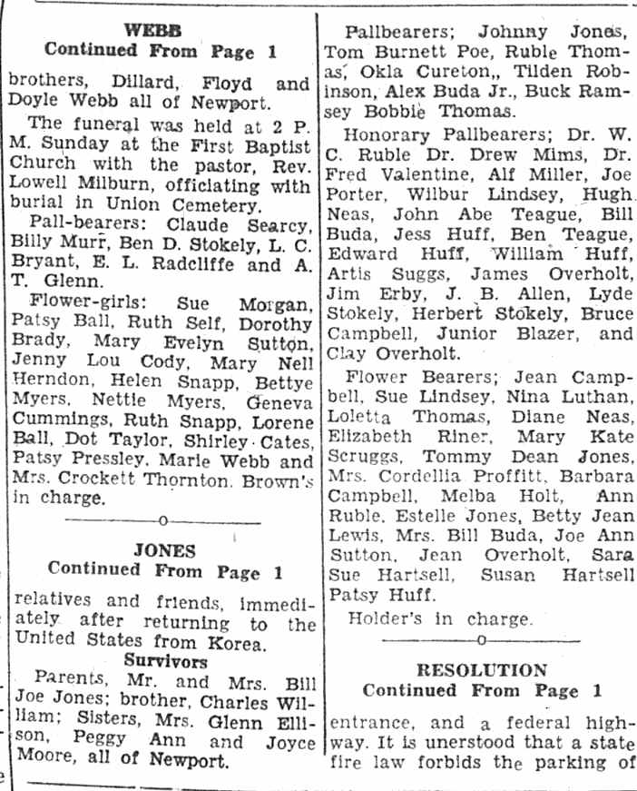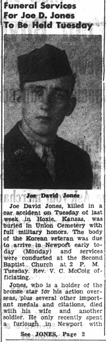 Joe David Jones, killed in a car accident on Tuesday of last week in Hoxie, Kansas, was buried in Union Cemetery with full military honors. The body of the Korean veteran was due to arrive in Newport early today (Monday) and services were conducted at the Second Baptist Church.