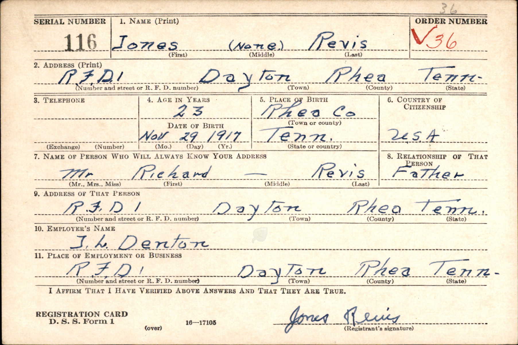 Jones Revis was born 29 November 1917 in Tennessee, the son of Richard Addison Revis and Mattie Jewell Roddy.