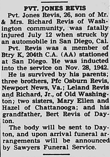 Pvt. Jones Revis, 26, son of Mr. and Mrs. Richard Revis of Washington cummunity, was fatally injured July 12 when struck by an automobile in San Diego, Calif. Pvt. Revis was a member of Battery K, 204th C.A. (AA) stationed at San Diego. He was inducted into the service on Nov. 28, 1942. He is survived by his parents; three brothers, Pfc. Osburn Revis of Newport News, Va., Leland Revis and Richard Jr., of Old Washington; two sisters, Mary Ellen and Hazel of Chattanooga; and his grandfather, Bert Revis of Dayton. The body will be sent to Dayton, and upon arrivl funeral arrangements will be announced by Sawyers Funeral Service.