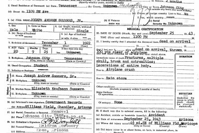 Joseph was returned home and services were conducted at the St. John’s Episcopal Church with members of the local Boy Scouts as flower bearers. His military escorts were from the 12th College Training Detachment, State Teachers College. Joseph was interred in Section I, Lot 279, Space 5 at the Monte Vista Memorial Gardens in Johnson City.