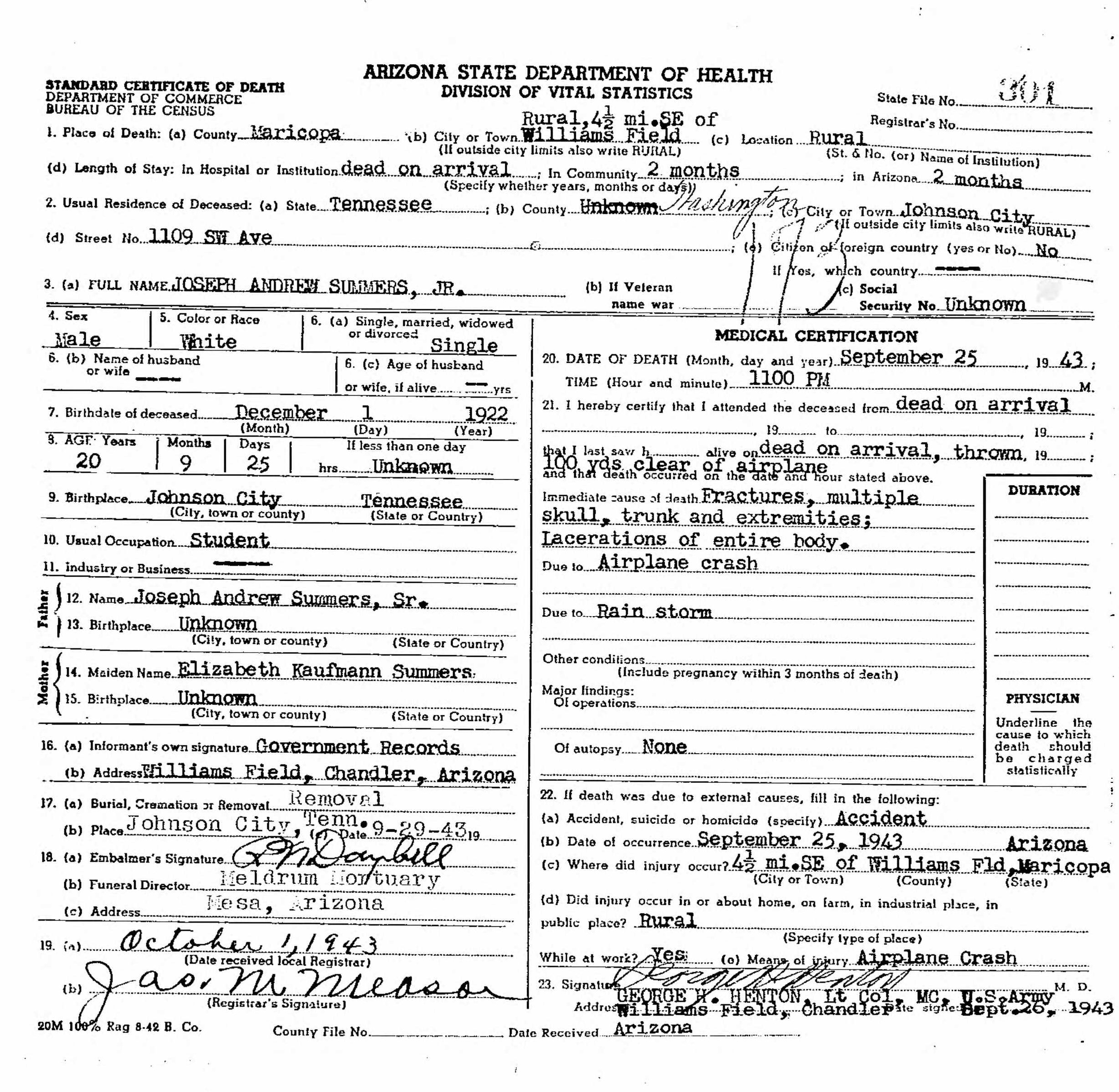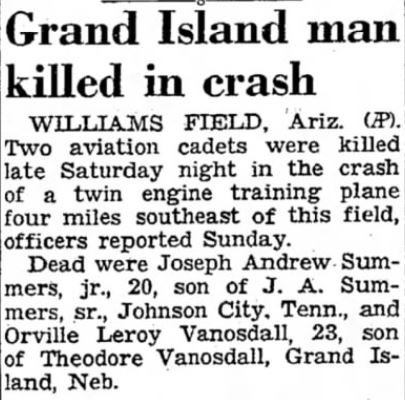 After he completed the nine week training course at Chico, Joseph was sent to Williams Army Airfield (AAF) in Mesa, Maricopa County, Arizona for Advanced Flight Training. He was assigned to the 533rd Flying Training Squadron and was flying a Curtiss-Wright AT-9, called a Jeep, tail number 41-5865 in bad weather on 25 September 1943. Control of the aircraft was lost due to this bad weather crashing four and a half miles south southwest of Williams AAF. He along with another Aviation Cadet were killed in the crash.