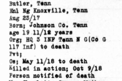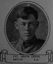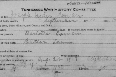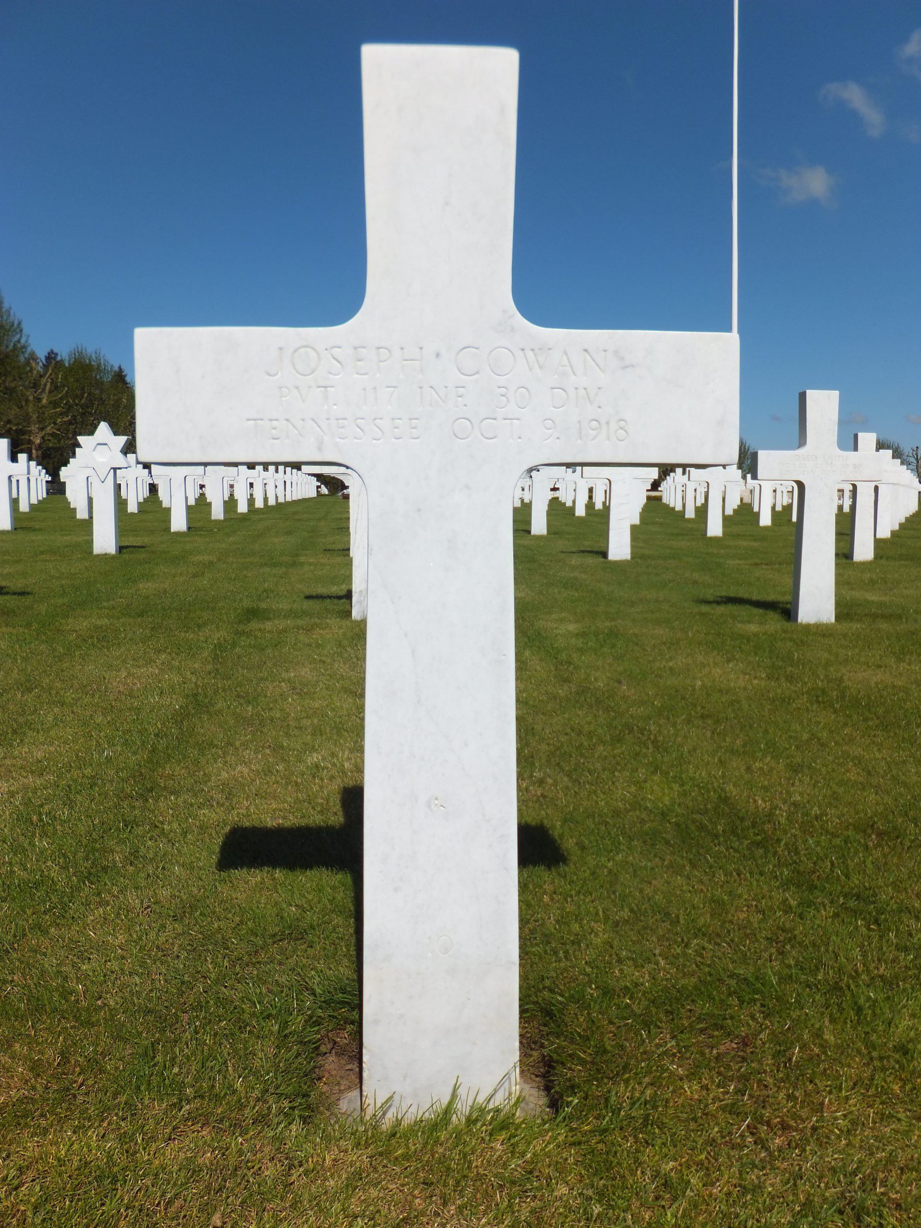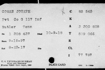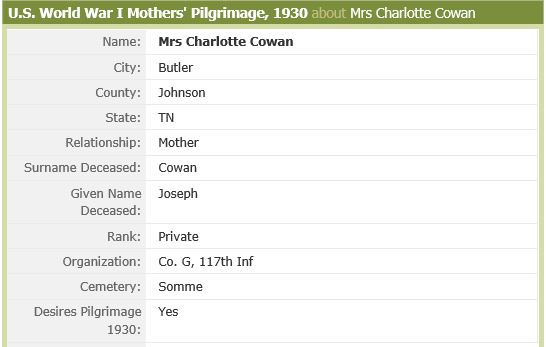 Joseph Hyder Cowan was born in Johnson County, Tennessee to Charlotte Cowan. He entered the service August 22, 1917 at Elizabethon and trained at Camp Sevier in Greenville, South Carolina. He sailed to Europe May 16, 1917 arriving on May 25. He servied with the 117th Infantry Regiment, 30th Division AEF. He was killed in action on 9 October 1918 at the age of 19, and is buried plot A, row 18, grave 10, at Somme American Cemetery, Bony, France.