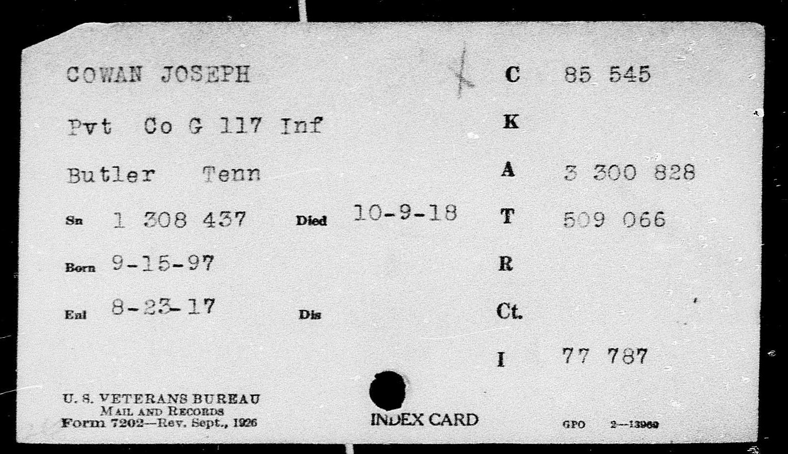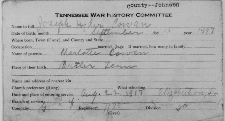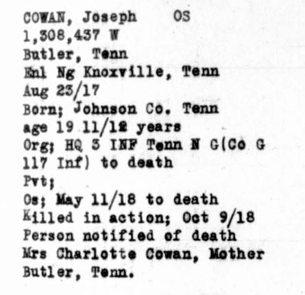 Joseph Hyder Cowan was born in Johnson County, Tennessee to Charlotte Cowan. He entered the service August 22, 1917 at Elizabethon and trained at Camp Sevier in Greenville, South Carolina. He sailed to Europe May 16, 1917 arriving on May 25. He servied with the 117th Infantry Regiment, 30th Division AEF. He was killed in action on 9 October 1918 at the age of 19, and is buried plot A, row 18, grave 10, at Somme American Cemetery, Bony, France.