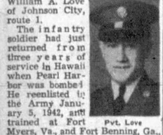 Pvt. Joseph D. Love, 32, was killed in action in France September 23, the War Department has notified his parents, Mr. and Mrs. William A. Love, of Johnson City, Route 1. The infantry soldier ahd just returned from three years of service in Hawaii when Pearl Harbor was bombed. He reenlisted in the Army January 5, 1942, and trained at Fort Myers, Va., and Fort Benning, Ga., going overseas last June. Surviving besides the parents are five sisters, Mrs. Oscar Falin of Concord, Mrs. Ella Guinn, Mrs. Dan White and Mrs. Ralph Runion, all of Erwin, and Miss Jesse Love of Johnson City, and two brothers, Staff Sgt. N. Douglas Love, with the Army Air Corps in France, and Seaman Second Class John B. Love, serving in the South Pacific area.