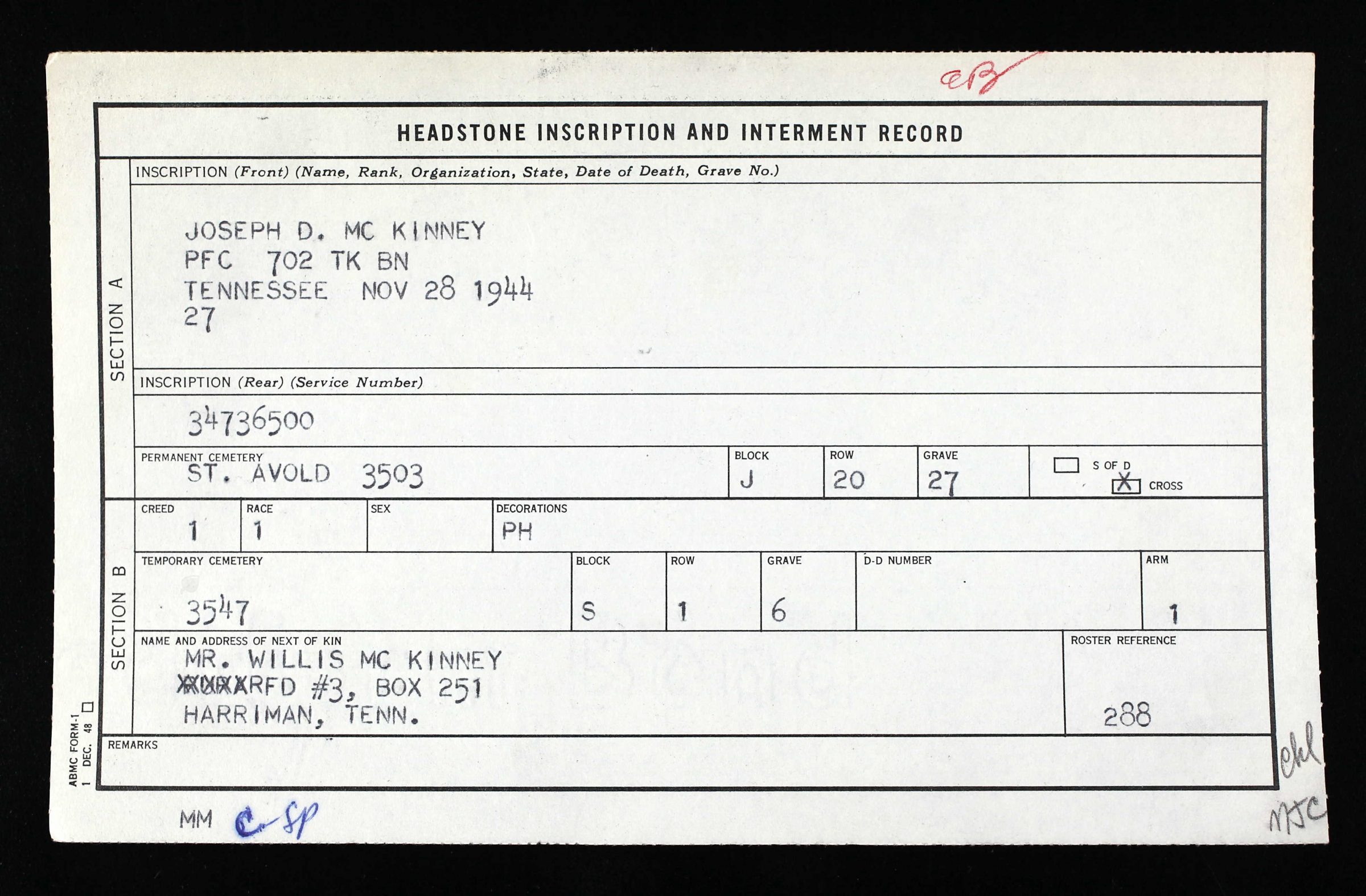 Private First Class McKinney served in Company A, 702nd Tank Battalion Red Devils. He was listed as Missing in Action, then changed to Killed in Action at Farebersville. He was initially buried at Limey Cemetery in Toul, France and reburied at Lorraine American Cemetery, St-Avold France, J,20,27.