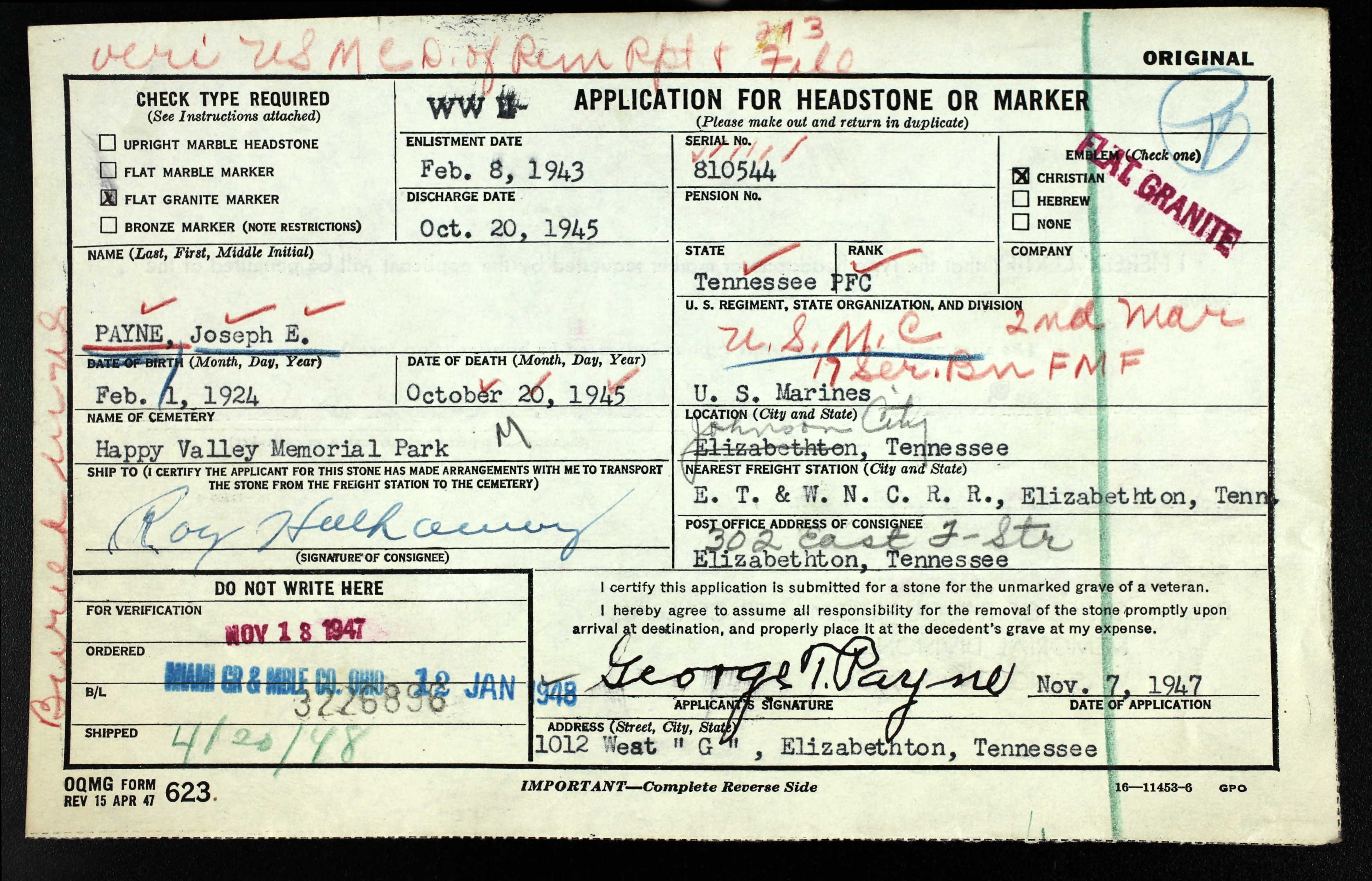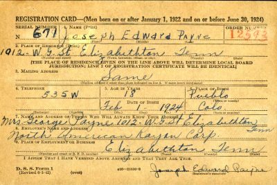 Next of kin George T. Payne, 1012 West G. Street, Elizabethton.