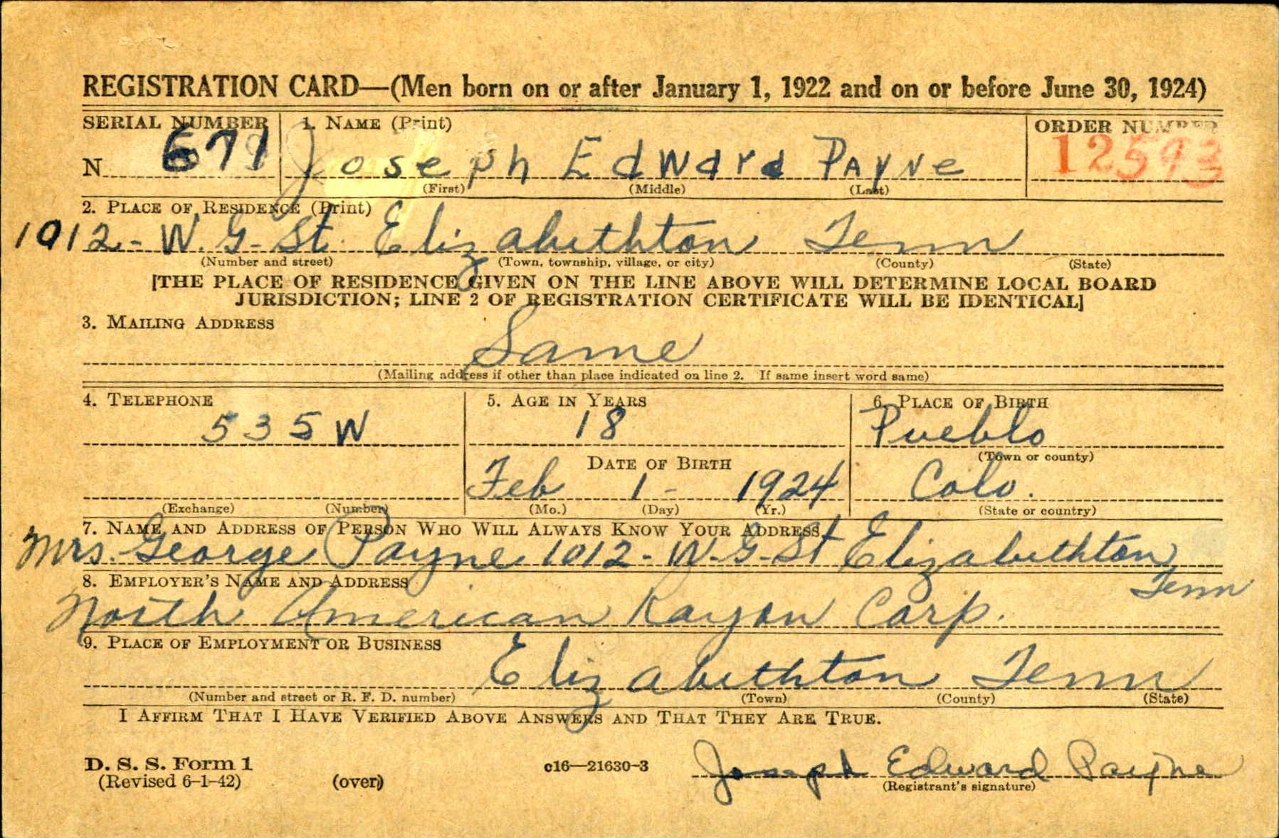 Joseph Edward Payne was born on 1 February 1924 in Pueblo, Colorado to George Thomas Payne and Ada Louise Gouge.