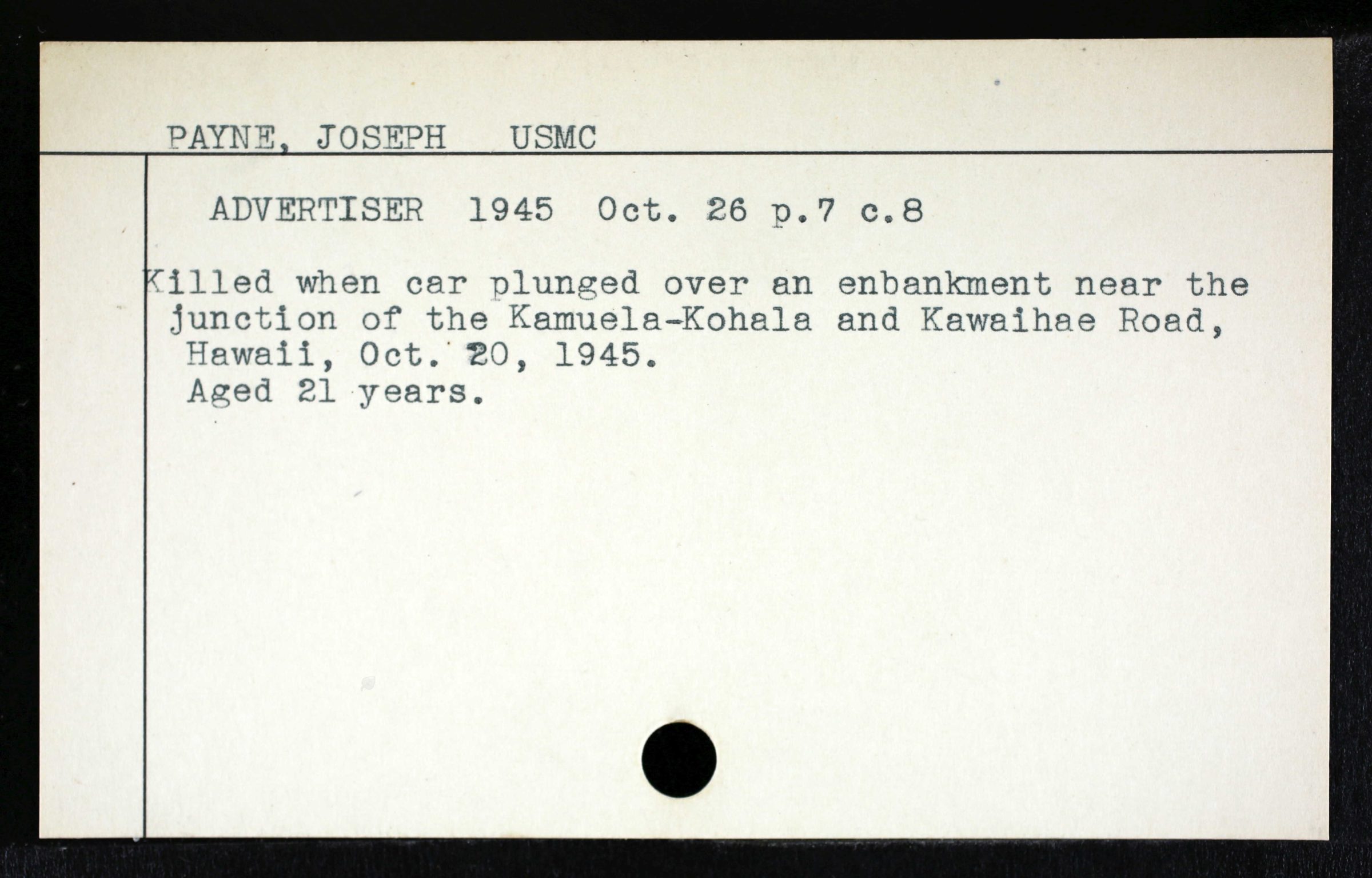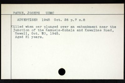 Died non battle on 20 October 1945. He was killed when his car plunged over an enbankment near the junction of the Kamuela-Kohala and Kawaihae Road in Hawaii.
