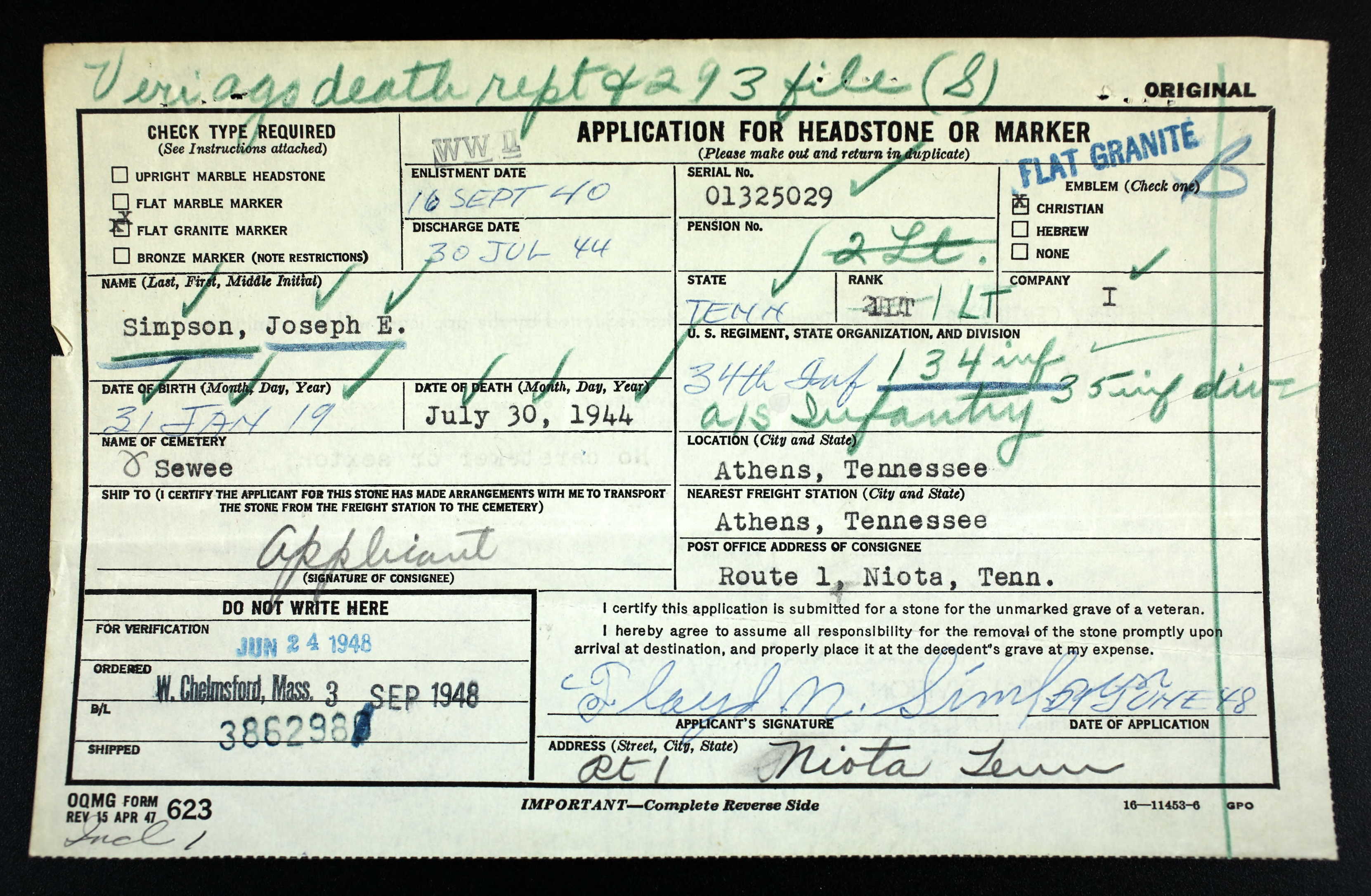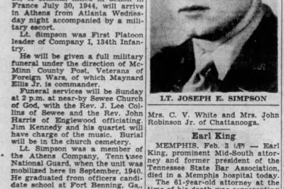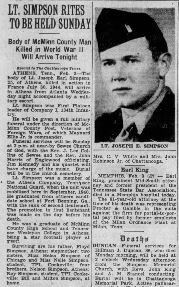 The body of Lt. Joseph Earl Simpson, 25, of Athens, killed in action in France July 30, 1944, will arrive in Athens from Atlanta Wednesday night accompanied by a military escort. Lt. Simpson was First Platoon leader of Company I, 134th Infantry. He will be given a full military funeral under the direction of McMinn County Post, Veterans of Foreign Wars, of which Maynard Ellis Jr. is commander.