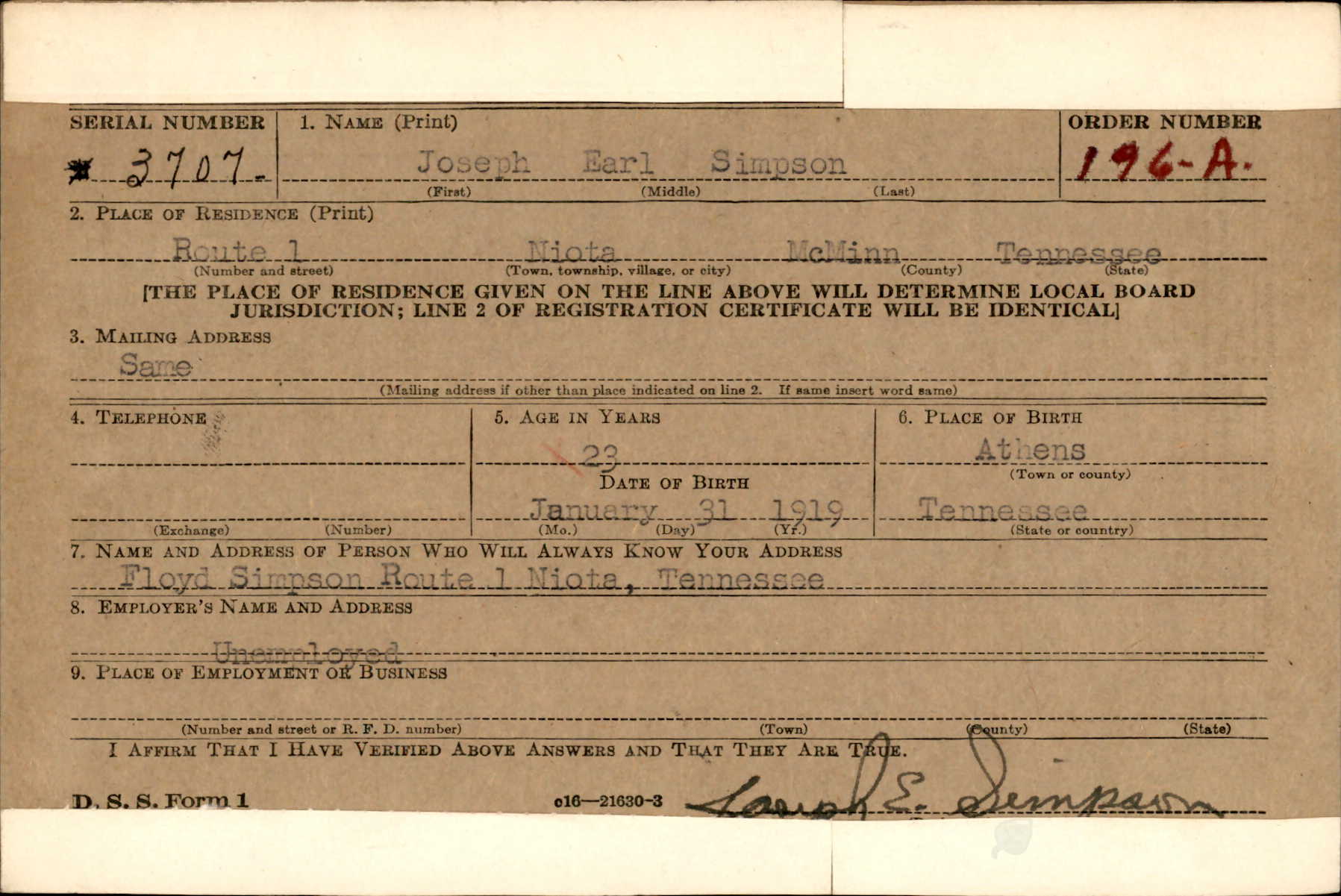 Joseph Earl Simpson was born on 31 January 1919. He was the son of Floyd Nelson Simpson and Velma Mae Hutsell. He attended McMinn County High School.