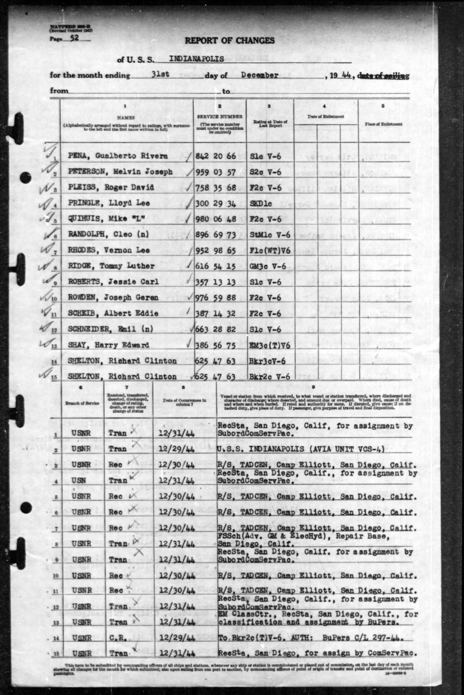 Joseph “Joe” Geren Rowden served on the USS Indianapolis (CA-35). The Indianapolis on 30 July 1945 was en route from Guam to Leyte Gulf. After delivering the components for the atomic bomb to Tinian Island, his ship was torpedoed and sunk July 30, 1945. He was lost at sea along with 879 fellow crewmen.