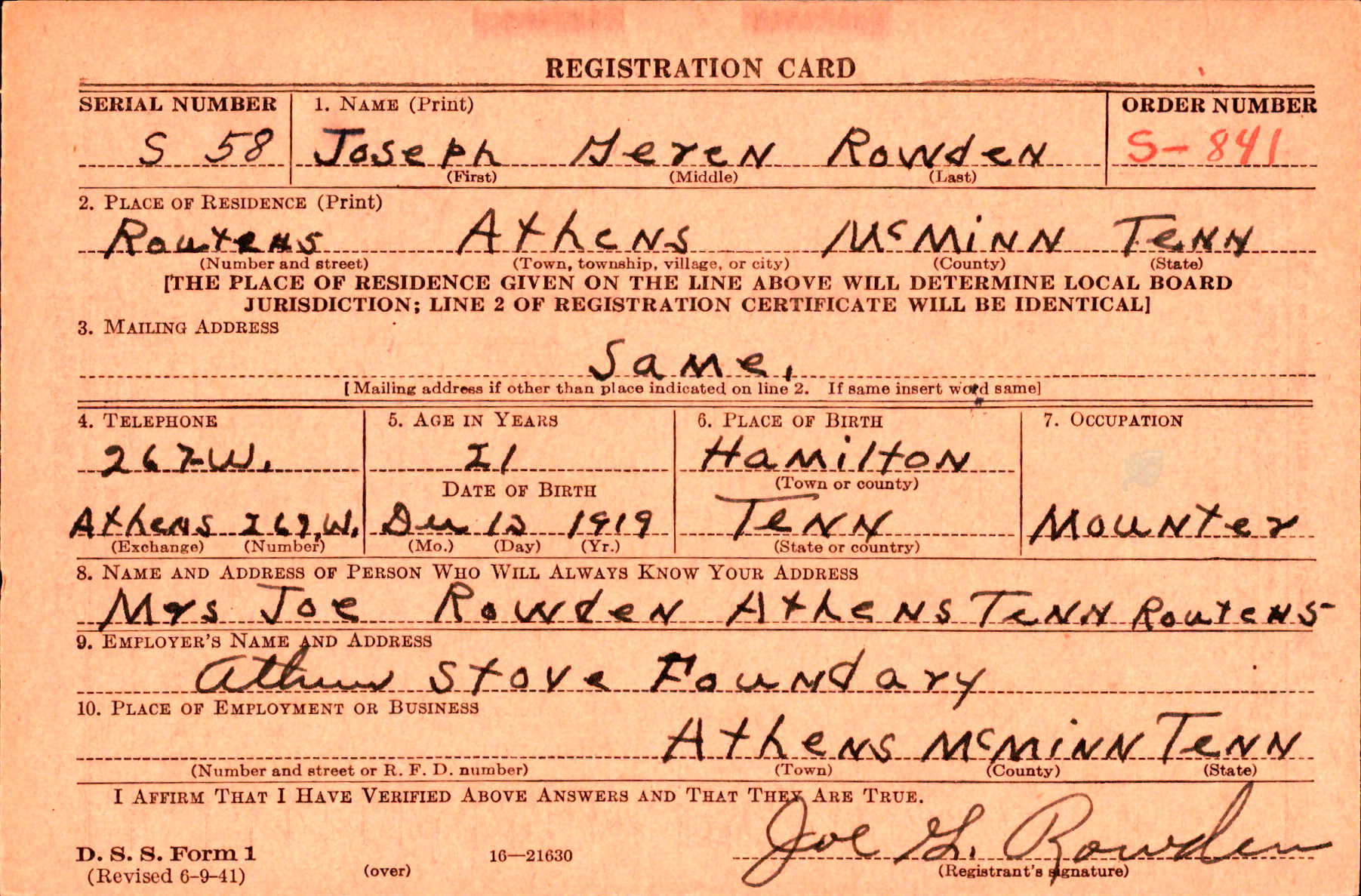 Wife: Mrs. Margaret Eaves Rowden, Rt 3, Athens, TN