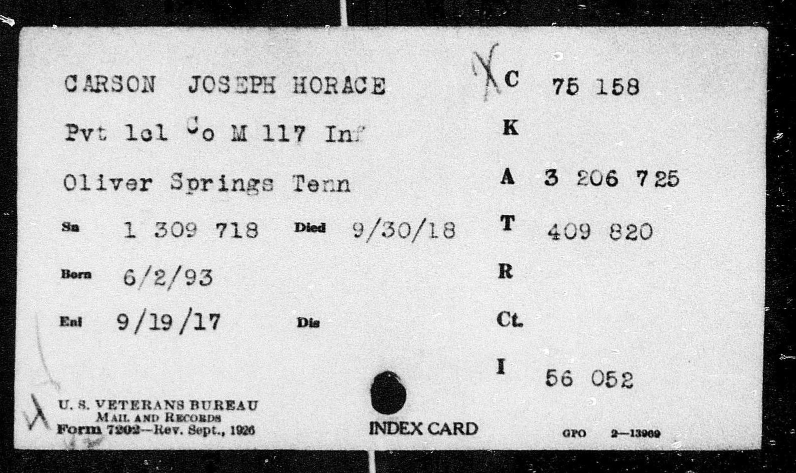 Joseph Horace Carson was born 2 June 1893, Oliver Springs, Tennessee to Isaac Christenberry Carson and Rebecca Jane Williams Carson of Coalfield. He was a miner before entering the service on 18 September 1917. He trained at Camp Sevier, Greenville, SC, and Camp Gordon, Atlanta, GA. He sailed to Europe on 11 May 1918, arriving on 24 May 1918.