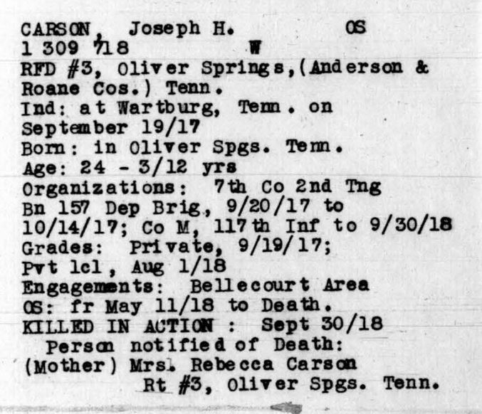 “The government has delivered the remains of Mr. Joseph Carson to his parents at home near Oliver Springs. Mr. Carson was drafted into the army in 1917 and was soon taken to France. He served his country faithfully until September 28, 1918 when he was struck by a piece of shell and there he gave his life for his country.